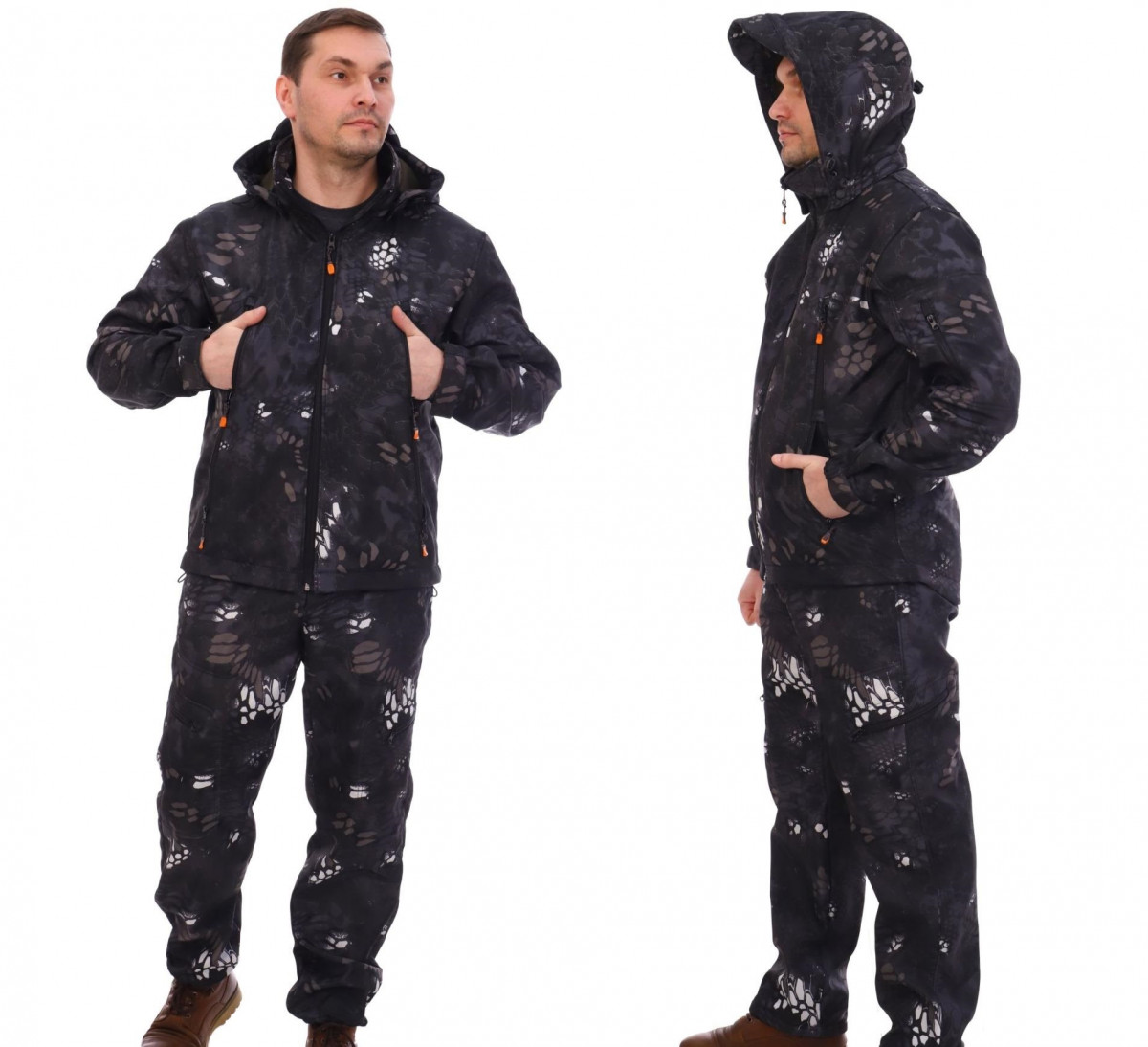остюм демисезонный Форестер из ткани полофлис камуфляжной расцветки Piton Black (камуфляж - Питон темный). Костюм состоит из куртки прямого кроя и брюк. Эксплуатация костюма до +5 С.Куртка на молнии с 4-мя прорезными вертикальными карманами и одним на рукаве, капюшон отстегивается. На рукавах эластичные манжеты и элементы регулировки ширины на липучках. Низ куртки утягивается эластичным шнуром с фиксаторами.Брюки на эластичном поясе, есть шлевки под ремень. Брюки имеют два боковых кармана и два на бедрах на молнии. Брючины по низу утягиваются эластичным шнуром с фиксатором.