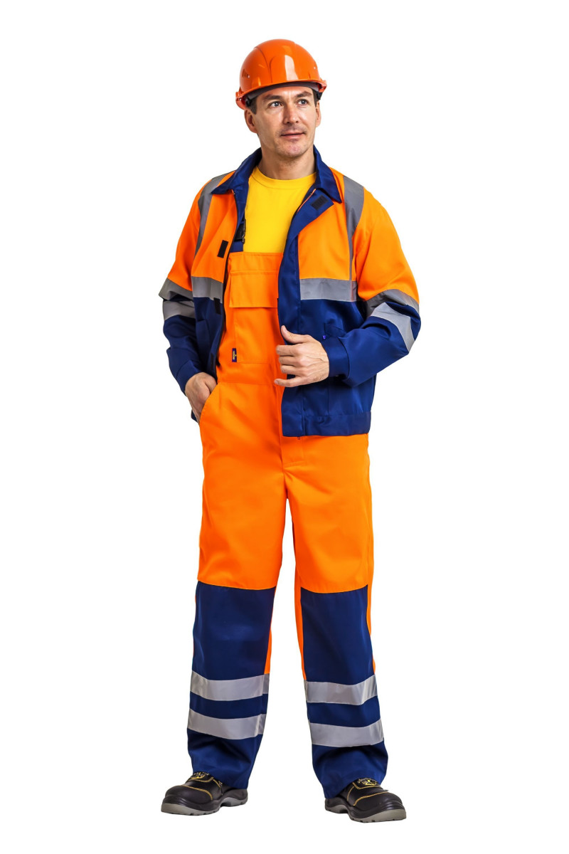 Костюм - куртка и полукомбинезон. Куртка укороченная с отложным воротником, центральной застежкой на молнию с ветрозащитной планкой. Нижние боковые прорезные карманы. Рукава с манжетами, застегивающиеся на пуговицы. Полукомбинезон с высокой грудкой, удобным нагрудным карманом с клапаном, застежка на пуговицы в боковой части и впереди. Имеются боковые карманы, функциональный карман для инструмента сзади. Бретели с эластичной тесьмой, застежкой на фастексы. Костюм с лентой СОП 50 мм на груди, спинке, рукавах и по низу брюк, соответсвует III классу сигнальной защиты.