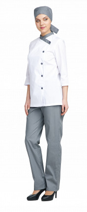 Комплект состоит из куртки, брюк, банданы Куртка: • полуприлегающего силуэта • смещённая бортовая застёжка на петли и пуговицы • воротник — стойка из отделочной ткани • рукава втачные 3/4 Брюки: • прямые по всей длине • пояс с эластичной лентой Бандана: • с завязками Цвет: белый-серый Ткань: 'тиси' Состав: 35%х/б 65%п/э пл.120г/м2