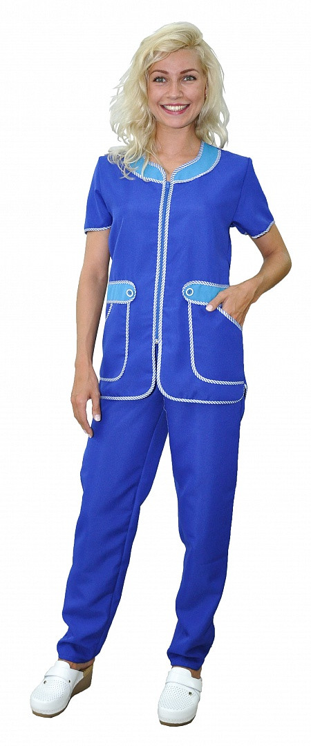 -КУРТКА: -укороченная, прямого силуэта с коротким рукавом и центральной застежкой на молнии -фигурный вырез горловины и верхний срез карманов декорированы отделочными деталями из контрастной ткани -спинка прямая без отделки, с двумя полупоясами для регулировки объема -все срезы костюма окантованы капроновым кантом -для увеличения прочности куртки выполнено дополнительное усиление швов центральной застежки БРЮКИ: -прямые -на резинке