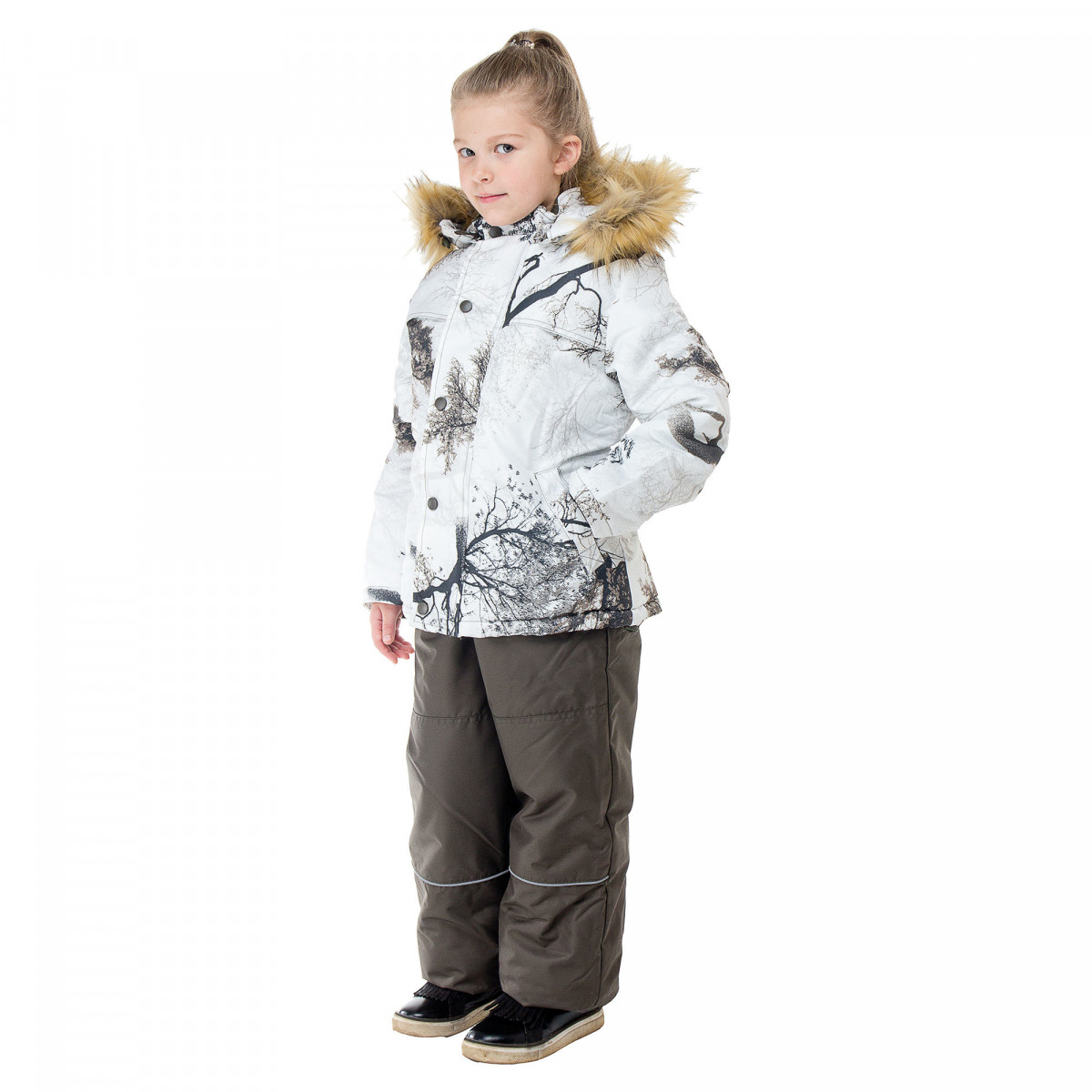 Куртка утепленная с центральной застежкой на тесьму-молнию закрывающуюся ветрозащитной планкой. Спинка и полочки с кокетками. В нижней части полочек прорезные карманы с листочкой . Рукава втачные одношовные, с напульсниками. Ширина куртки в области талии и по низу регулируется с помощью кулисы. Капюшон пристегивающийся со съемной меховой опушкой. Лицевой срез капюшона стягивается резинкой. Полукомбинезон прямого силуэта, с центральной застежкой на тесьму –молнию.С накладными карманами с наклонным входом. Бретели регулируются с помощью резинки и фастексов. По линии талии резинка в области спинки. В полукомбинезоне предусмотрены внутренние снегозащитные манжеты. Усилительные накладки в области колен. Световозрвращающий кант.