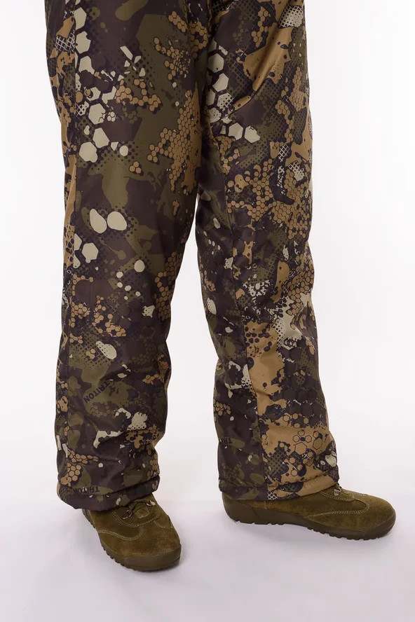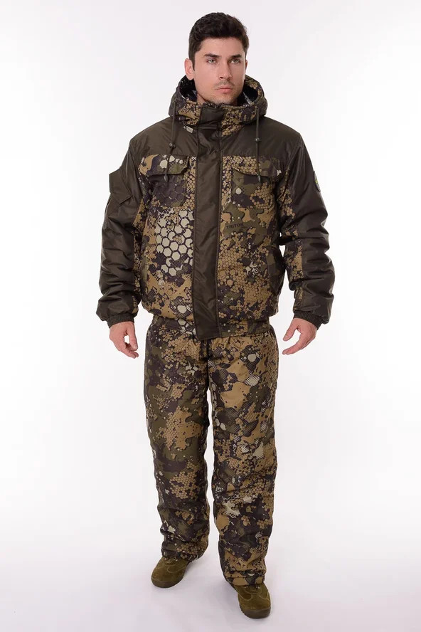 Основная ткань Дюспа Утеплитель Синтепон 350 г/м² Подклад фольгированный Мембрана 3000/3000 Съемный капюшон Капюшон и воротник отделаны флисом Трикотажные манжеты на рукавах + утяжка липа Молнии расширители по низу брюк + планка на липе Утяжка по низу куртки Лямки подтяжки типа горка, с перекрестием в области лопаток