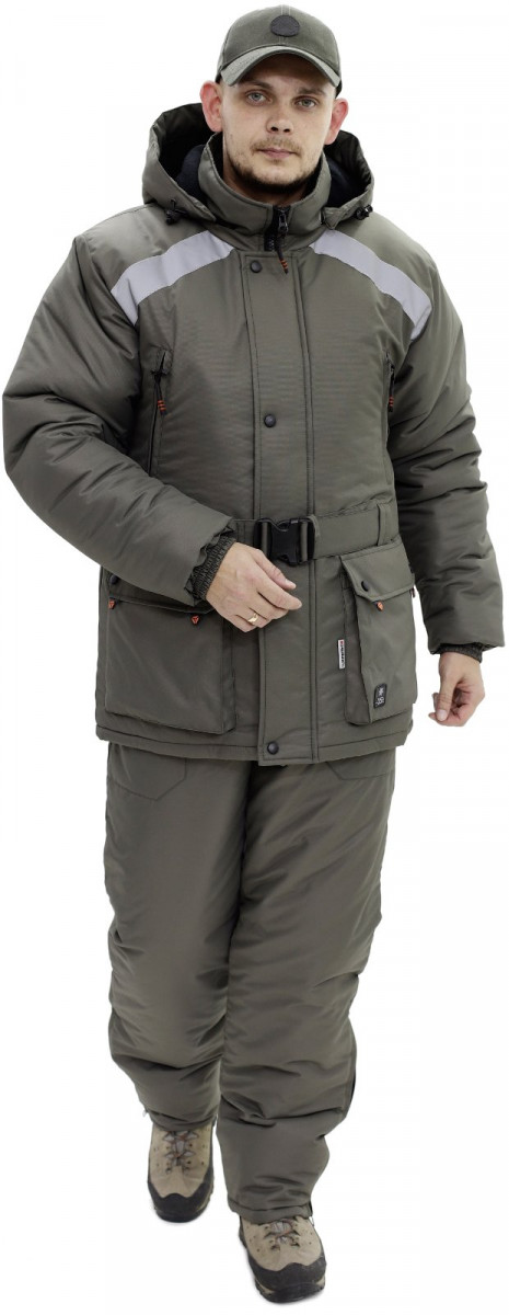 Прямая модель, на ремне. Ремень съёмный. Куртка три слоя утеплителя. Ткань Таслан. Капюшон отстегивается. Подклад лопатки флис. Молния Трактор-8 два бегунка. Куртка четыре кармана + карман внутри на молнии. П/К утеплитель два слоя. П\К два кармана. Низ брючин расстегивается для сапог ЭВА. Температура в активном режиме -35С. СО полоса по госту. Размеры с 44 по 70