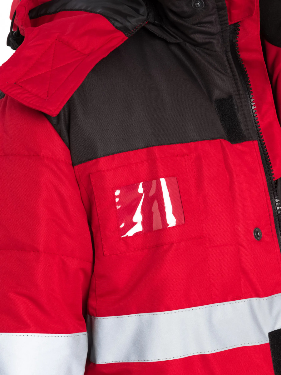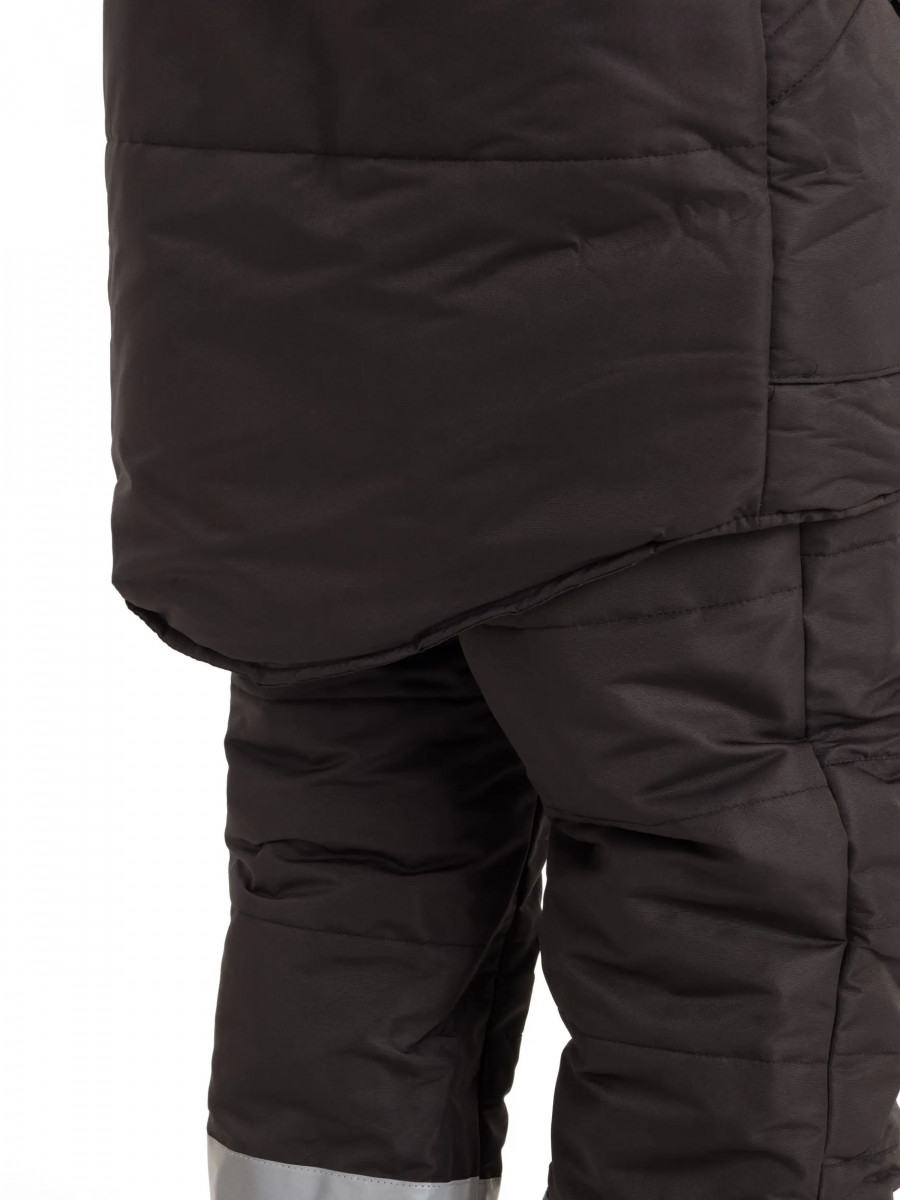 Костюм состоит из куртки и полукомбинезона. Куртка со светоотражающими полосами и кантом, с центральной застежкой на молнию, ветрозащитным клапаном на текстильную застежку с чередованием кнопок и внутреннюю планку с уголком для защиты подбородочной части от молнии. Воротник стойка, с внутренней стороны флис, съемный утепленный капюшон. На правой полочке нагрудный карман для бейджа. Рукава с внутренними трикотажными манжетами. Полукомбинезон со светоотражающими полосами , с центральной застежкой на молнию и планку на текстильную застежку, на регулируемых по длине бретелях. На правой передней половинке нагрудный карман для сотового телефона. Состав: 100% полиэстер Ткань: Taslan 228 Milky PU, пл.135 г. Ткань из 100% нейлона с нанесением полиуретанового покрытия Подкладка: Таффета 190Т Утеплитель куртка - синтепон 2 слоя по 150 г., Termofinn 150г.; полукомбез - синтепон 150 г., Termofinn 150г. Защита 3 класс защиты, lV и особый климатический пояс ГОСТ Р 12.4.236-2011