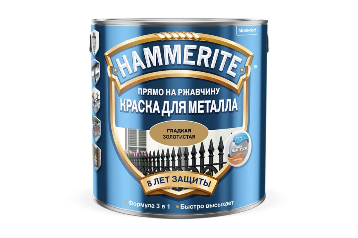 Краска для металла HAMMERITE прямо на ржавчину, предназначена для обработки металлических, деревянных, стеклянных, пластиковых, кафельных поверхностей (решеток, заборов, ворот, садовой мебели, инструмента). Возможно нанесение состава на неокрашенные (ржавые) поверхности. Применяется для внутренних и наружных работ.