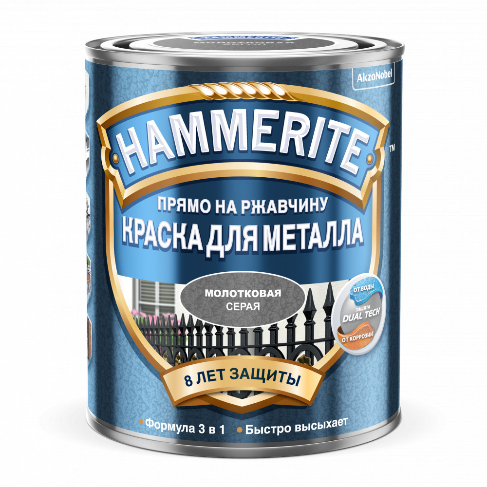 Молотковая эмаль с добавлением силикона. Прекрасно подходит для металлов, используется для дерева и различных видов пластика. С ее помощью создают износостойкое и долговечное антикоррозийное покрытие. Эмаль становится эффективной защитой от ржавчины. Молотковая эмаль Hammerite подходит как для цветных, так и черных металлов. Срок антикоррозийного эффекта составляет как минимум 8 лет.ПодготовкаОтслаивающуюся краску и рыхлую ржавчину снимают. Обезжиривают растворителем. Чтобы получить чистую металлическую поверхность, применяют наждачную бумагу или металлическую щетку. Окрашенное металлическое покрытие промывают раствором обычного стирального порошка, потом – водой, затем высушивают.НанесениеМолотковую эмаль необходимо тщательно перемешать перед нанесением. Покрывают поверхность валиком или кистью в 2 слоя, в 3 слоя – распылителем при температуре не менее +8°С и не более +25°С. Следующий слой наносится через 5 часов.