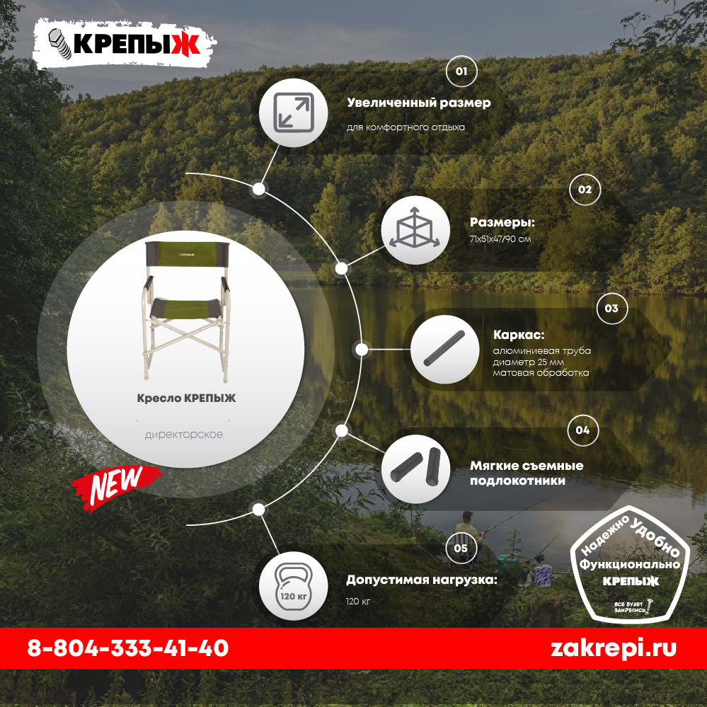Удобное кресло увеличенного размера для комфортного отдыха на природе. Надежная устойчивая конструкция из алюминиевой трубы. Мягкие съемные подлокотники. Кресло очень легко складывается и раскладывается, компактные размеры в сложенном виде обеспечивают удобство переноски и перевозки.