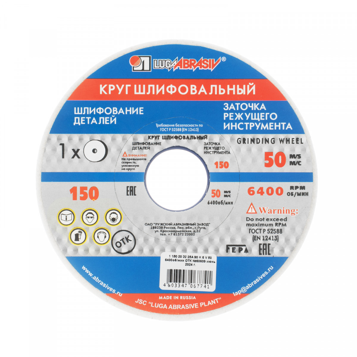 Шлифовальный круг Луга 73458 размером 150 х 20 х 32 мм, с абразивом 25A (белый электрокорунд), с зернистостью F90 и твердостью K, L, служит для сухого и мокрого шлифования деталей из углеродистых, нержавеющих и быстрорежущих сталей. Применяется также для заточки и доводки режущих инструментов, в том числе мелких — сверл, зубьев, резцов, ножей.