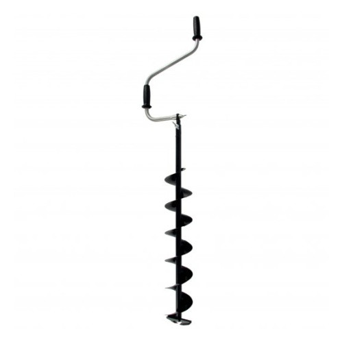 "Верхняя рукоятка ледобура смещена относительно оси ледобура на 105 мм, а нижняя на 165 мм. Такое расположение рукояток позволяет вращать ледобур одновременно двумя руками, тем самым увеличивая скорость бурения лунок во льду. Телескопическая штанга-удлинитель позволяет ступенчато увеличивать глубину бурения при необходимости. По сравнению с классическими ледобурами шаг витков шнека увеличен на 10 %, что обеспечивает более быстрое освобождение лунки от шуги и снижает усилие бурения. Ручки выполнены из мягкого пластика, который остается приятным на ощупь даже в сильные морозы."