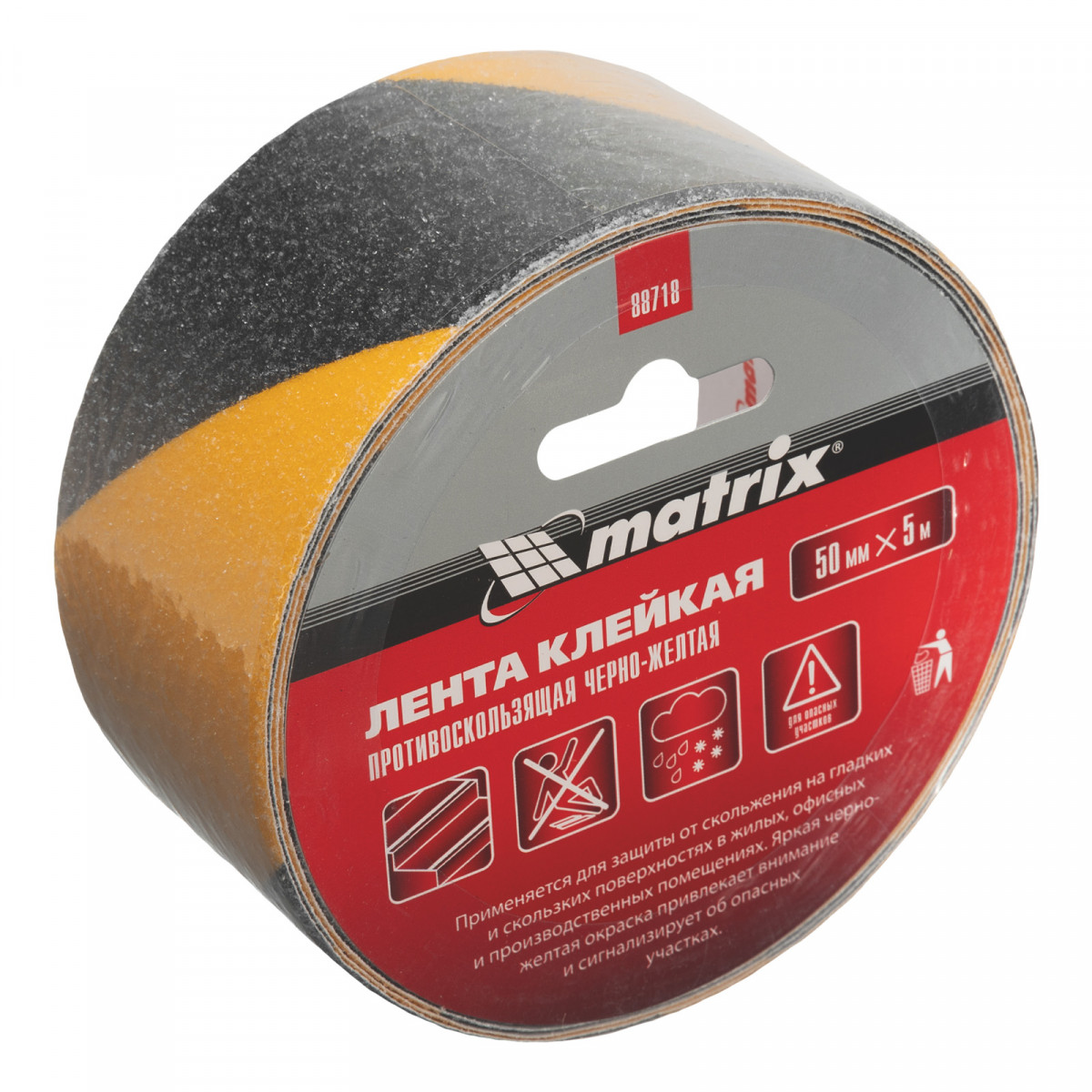 Клейкая противоскользящая лента Matrix 88718 черно-желтого цвета, размером 50 мм х 5 м, предназначена для предотвращения несчастных случаев на лестницах, кафельном полу и других скользких поверхностях. Позволяет обезопасить посетителей людных мест: общественного здания, многоквартирного дома, производства, магазина. Ленту следует наклеивать на очищенные сухие поверхности при температуре выше +12 °C.