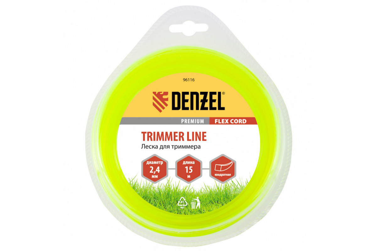 Леска для триммера Denzel FLEX CORD 96116 с квадратным сечением, диаметром 2,4 мм и длиной 15 м, поставляется в блистере и рассчитана на скашивание газонной, жесткой и сухой травы, сорняков с толстыми стеблями, бурьяна и лопухов. Используется с электротриммерами мощностью 1-1,4 кВт, а также совместима с бензиновыми триммерами.