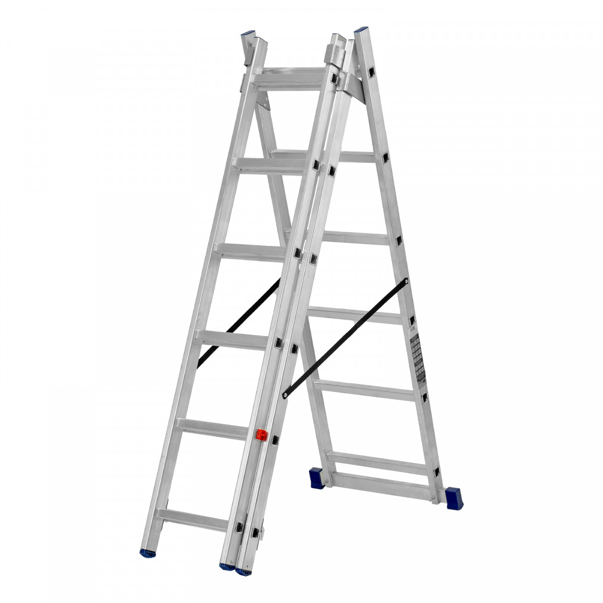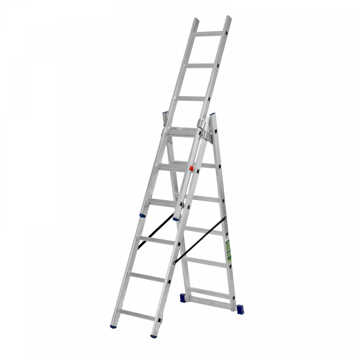 • Многофункциональность — лестница может использоваться в 3 различных вариациях — в качестве стремянки (с двумя расставленными и одной выдвинутой вверх секцией), двухсторонней стремянки (две секции расставлены, третья демонтирована) и приставной лестницы.