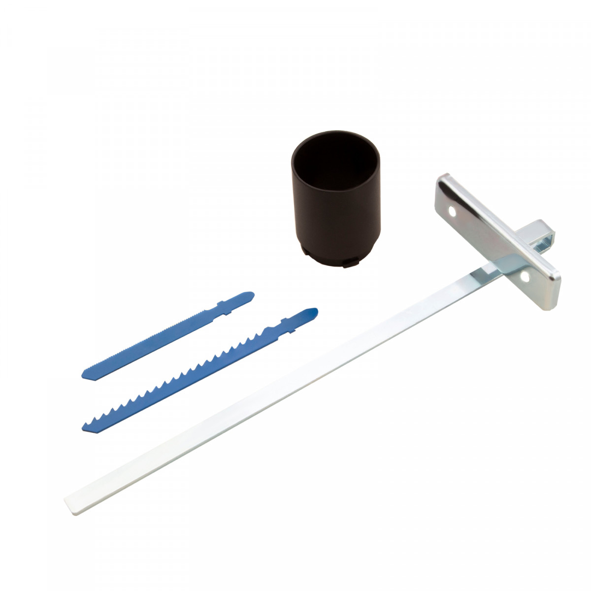 - Полная комплектация — лобзик поставляется с направляющей, пилками по дереву и металлу, шестигранным ключом, адаптером для подключения пылесоса и запасными угольными щетками.