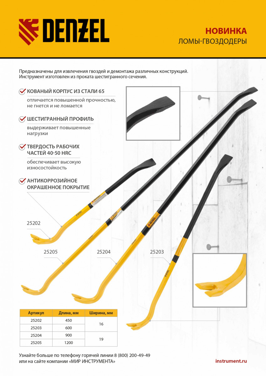Кованый корпус из стали 65 обеспечивает высокую прочность лома-гвоздодера Denzel 25205.
