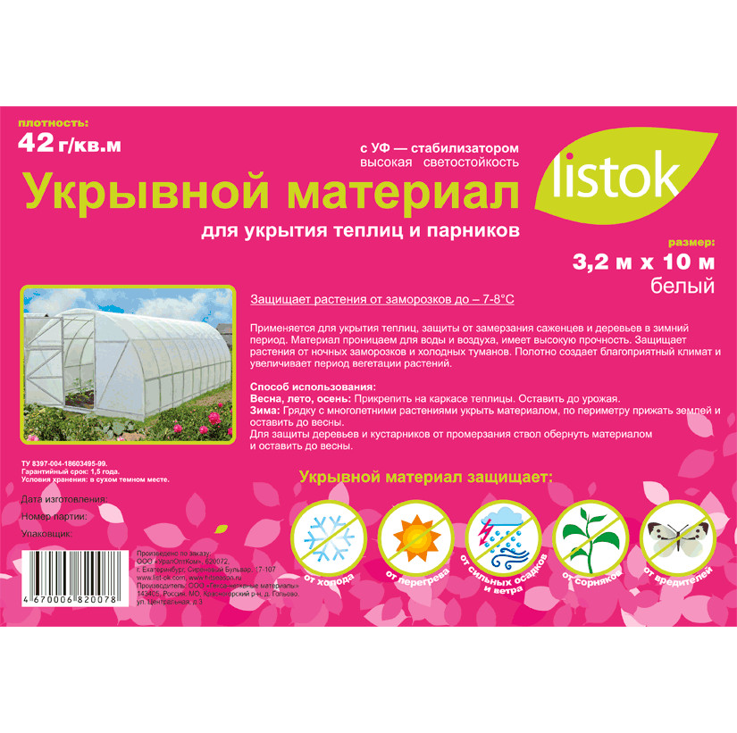 Защищает от заморозковдо -7-8С.Предназначен для покрытия каркасов теплиц и парников, штамбов деревьев, кустарников, многолетних растений, компостных ям.