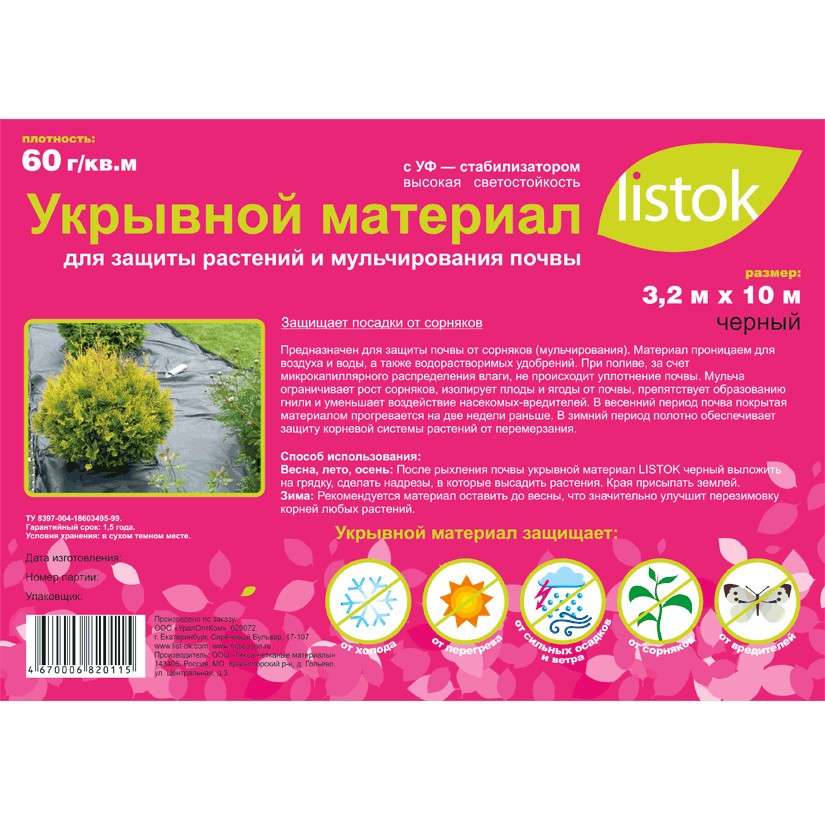Защищает от сорной растительности, испарения влаги. Для мульчирования почвы.