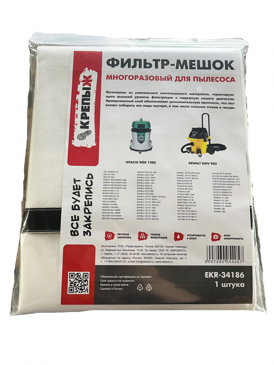 Мешок-пылесборник КРЕПЫЖ для пылесосов многоразовый синтетический EKR-34186 (до 36 л)