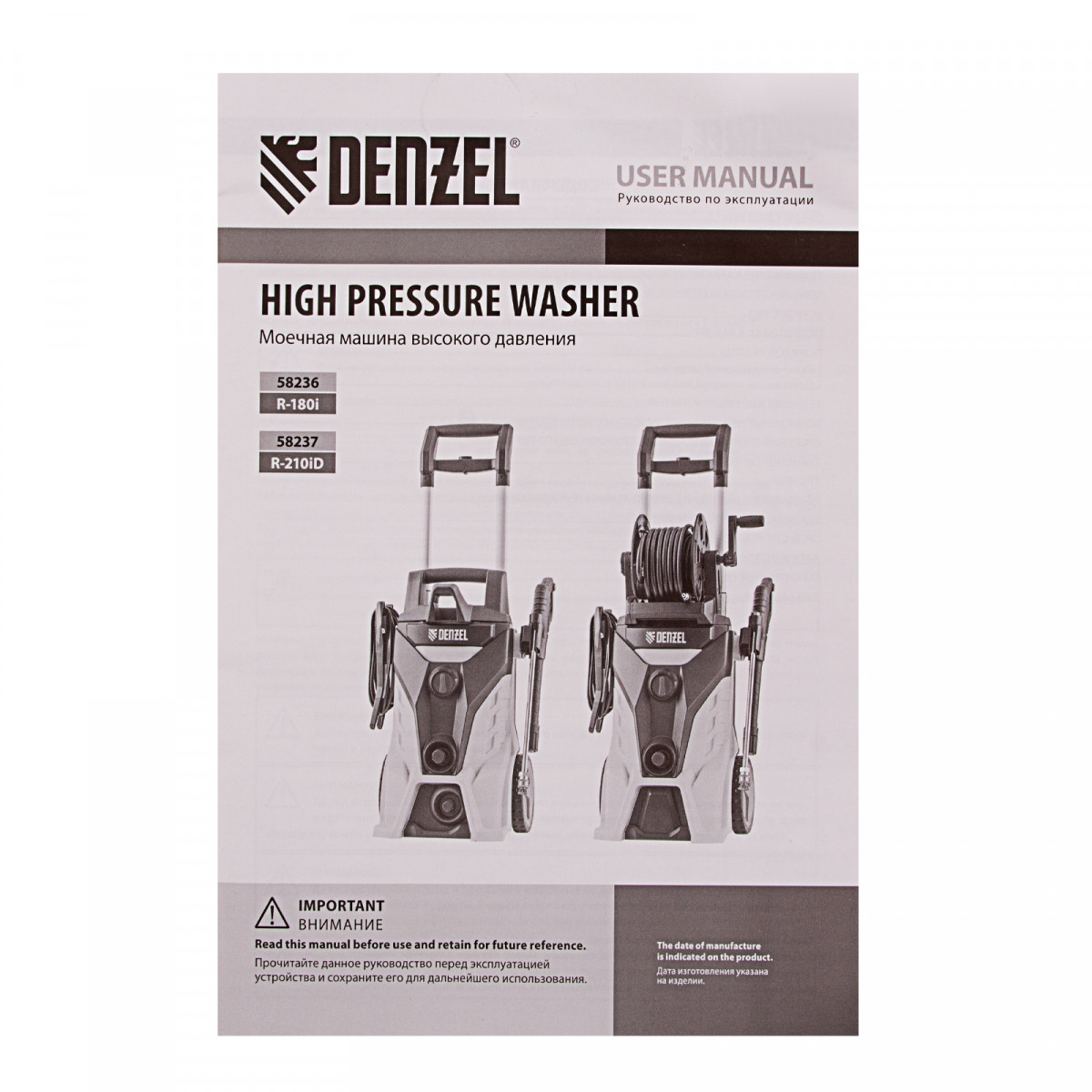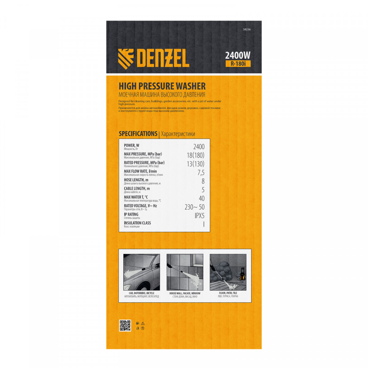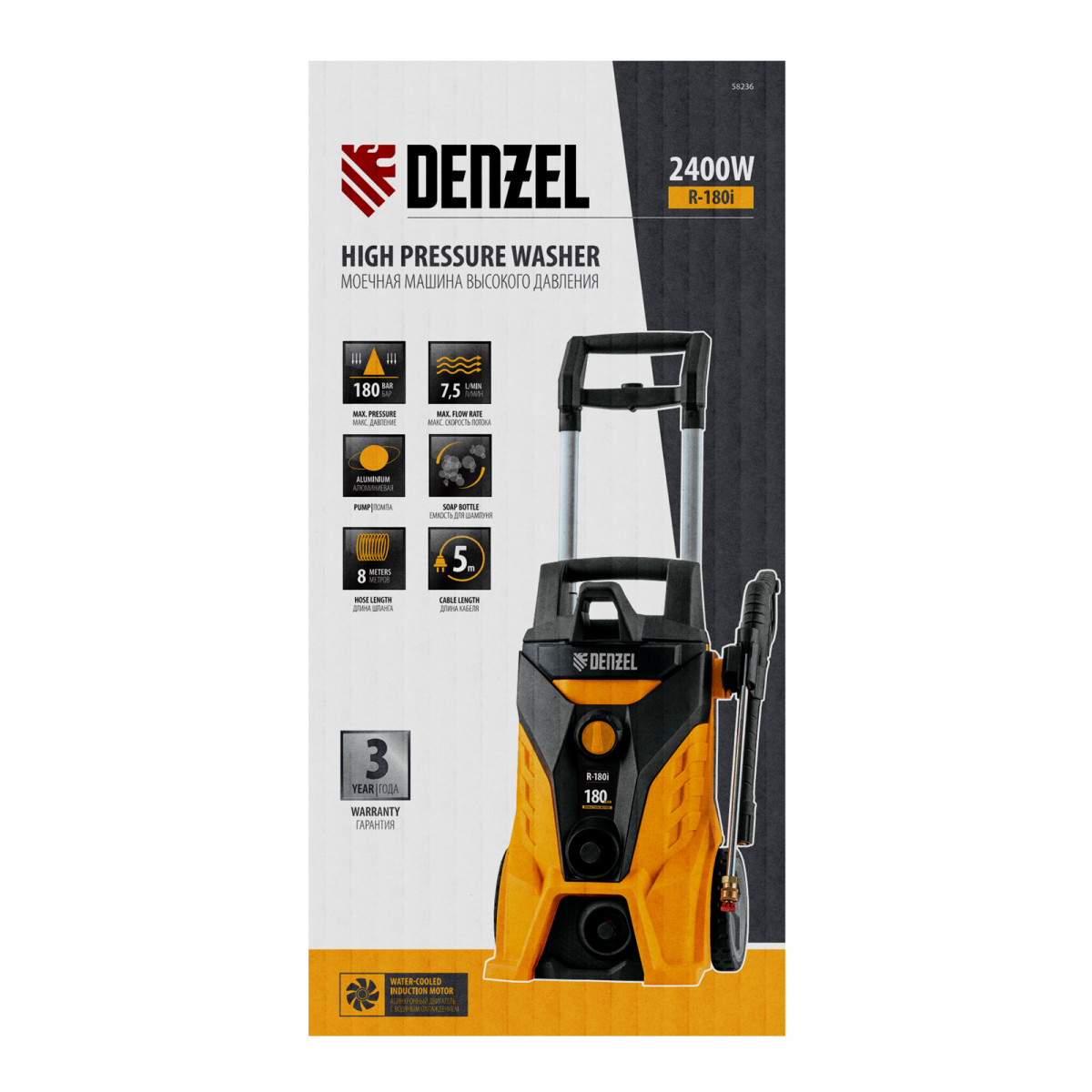 Моечная машина высокого давления R-180i, 2400 Вт, 180 бар, 7.5 л/мин, асинхронный двигатель Denzel