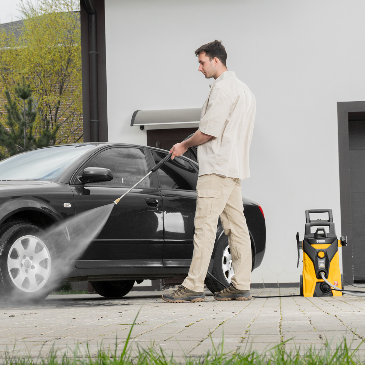 • Защита от случайного пуска — блокировка рычага пистолета позволяет включать автомойку только при полной готовности к работе.