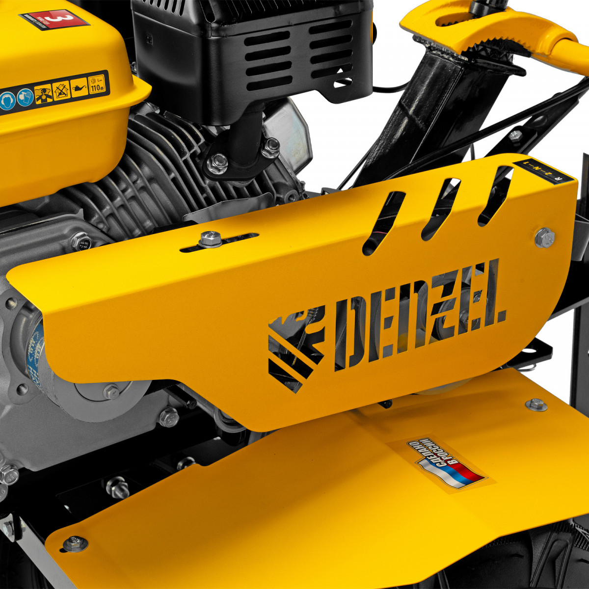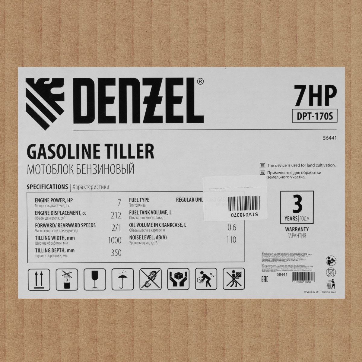 Мотоблок Denzel DPT-170S 56441 с двигателем мощностью 7 л. с., ременным механизмом сцепления, фрезами 3 х 4, шкивом отбора мощности (ШОМ) и коробкой передач 2В/1Н предназначен для проведения сельскохозяйственных работ. Максимальная ширина обработки составляет 1000 мм, глубина — 350 мм. Фрезы собираются из двух двойных и двух одинарных секций, что позволяет регулировать ширину вспашки. ,Шкив отбора мощности и универсальный кронштейн диаметром 30 мм позволяют установить любое навесное оборудование Denzel, например. плуг, окучник, картофелевыкапыватель. Такое решение значительно расширяет возможности мотоблока и позволяет минимизировать расходы на закупку сельскохозяйственной техники.