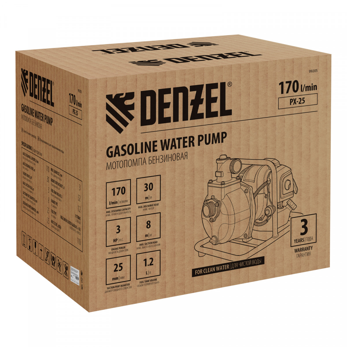 Бензиновая мотопомпа Denzel PX-25 99205 с 2-тактным двигателем мощностью 52 см3 и производительностью 170 л/мин обеспечивает глубину всасывания 8 м и напор 30 м. Предназначена для перекачивания чистой воды, используется для осушения затопленных подвалов и нижних этажей зданий, бассейнов. Подходит также для организации системы орошения на загородном участке.