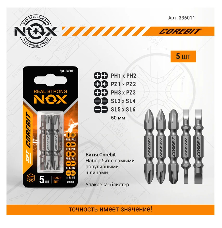 Бита NOX COREBIT– профессиональная бита для регулярных крепежных работ. 5 двусторонних бит с самыми популярными шлицами PH1, PH2, PH3, PZ1, PZ2, PZ3, SL3, SL4, SL5, SL6. Изготовлены из легированной стали марки S2, обладающей повышенной прочностью и износостойкостью. Твёрдость стали по шкале Роквелла 58-62 HRC. Шестигранный хвостовик ¼ HEX исключает проскальзывание оснастки в патроне электроинструмента. Биты NOX изготовлены методом фрезеровки , что обеспечивает точность формы биты в соответствии со стандартом DIN и гарантирует высокий ресурс биты. Подходит для работы электродрелью со стандартным трёхкулачковым зажимным патроном и шуруповёртом с шестигранным патроном для быстрой смены насадки.
