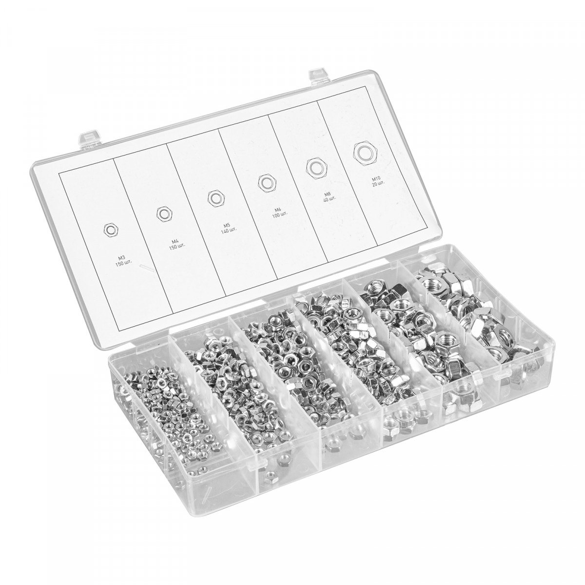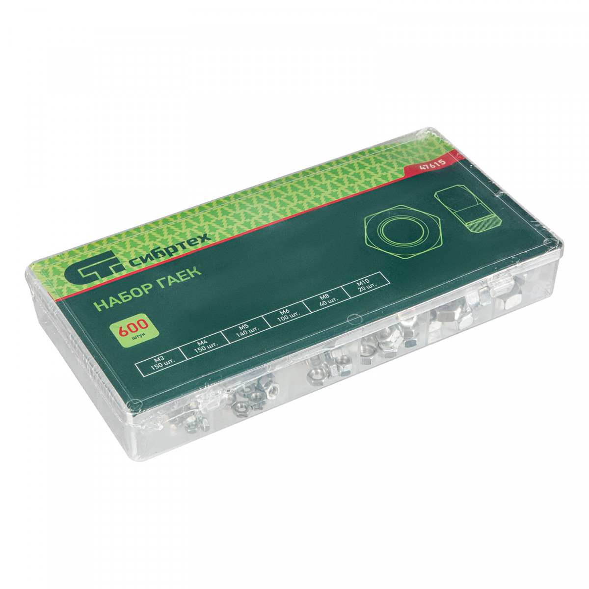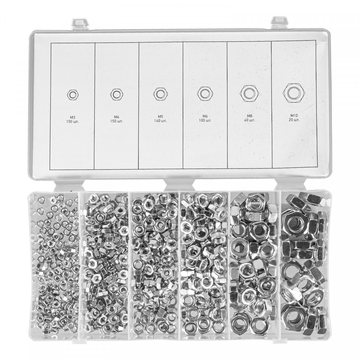 Набор гаек М3, М4, М5, М6, М8, М10, 600 предметов Сибртех