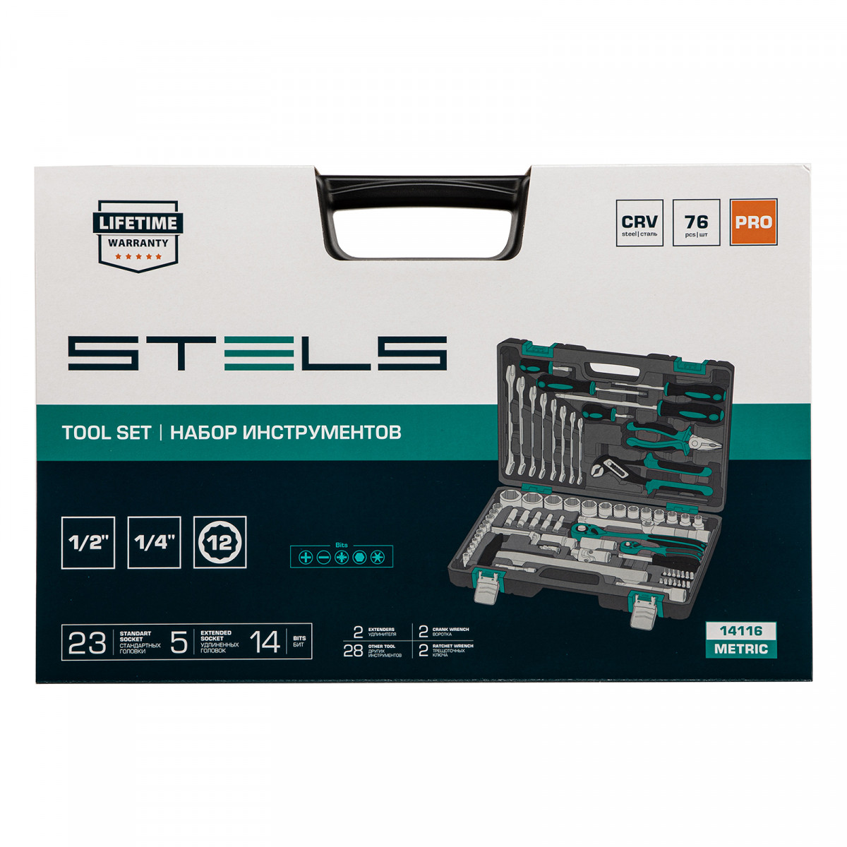 Набор инструментов, 1/2", 1/4", CrV, 12 гранные головки, пластиковый кейс, 76 предметов Stels