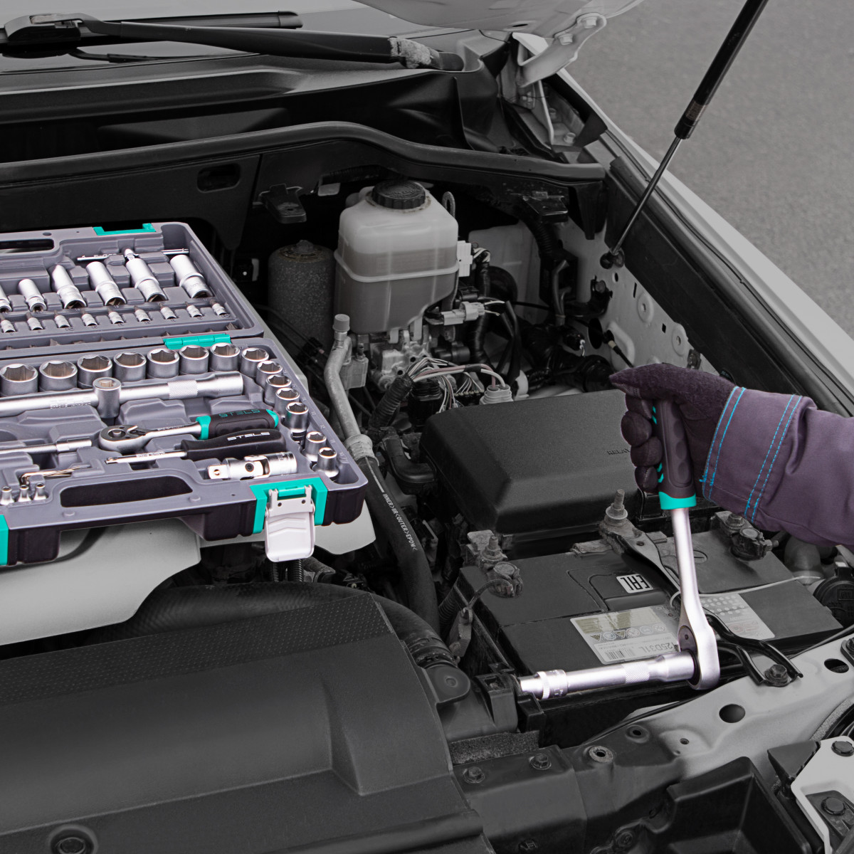 - Комфортная работа в труднодоступных местах — в набор входят ключи-трещотки с 72 зубьями, рабочий шаг составляет всего 5°.