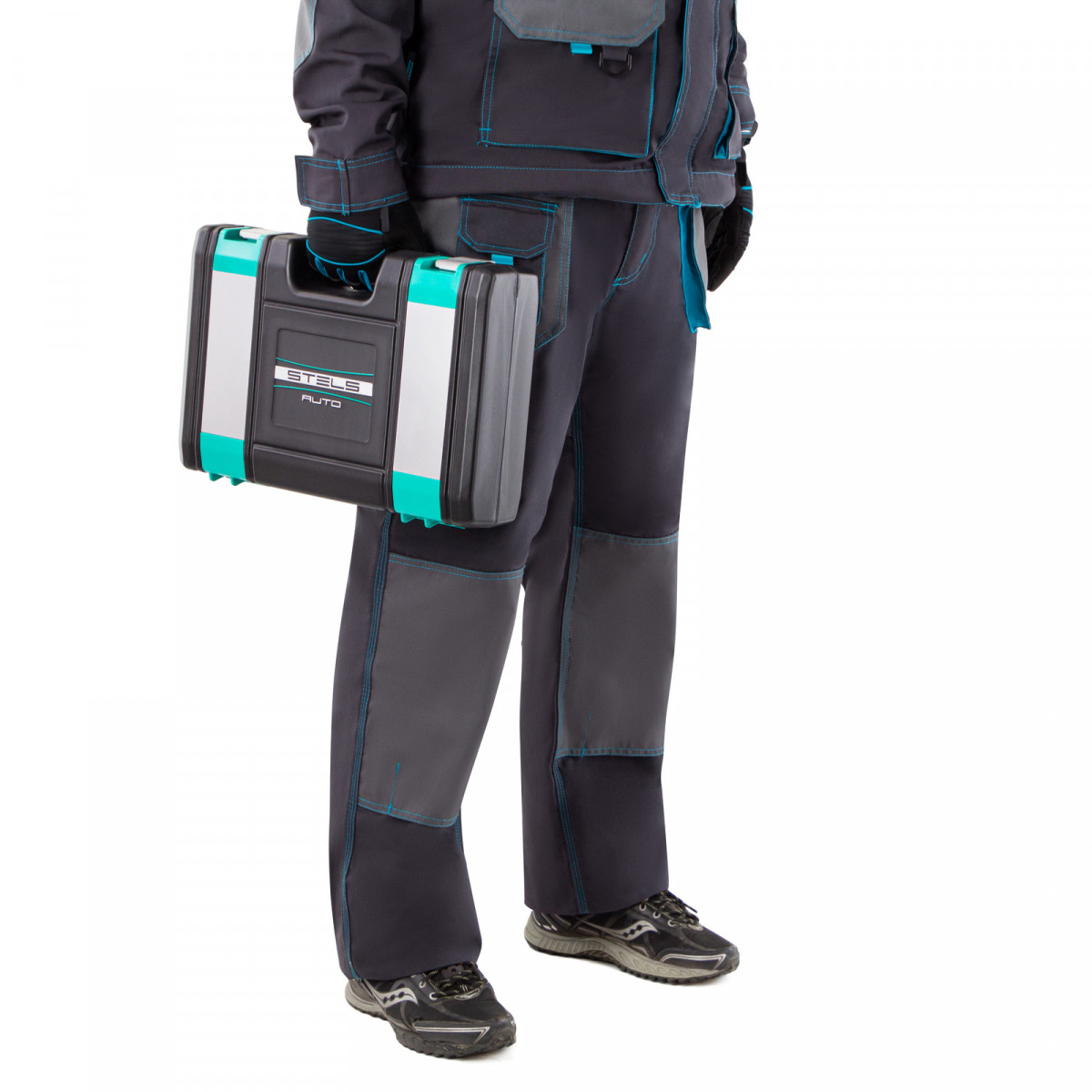 Набор инструментов Stels 14106 в ударопрочным пластиковом кейсе состоит из 94 предметов с присоединительными квадратами 1/2″ и 1/4″, из стали CrV и S2, и предназначен для выполнения слесарно-монтажных работ. Включает инструменты и насадки для работы с резьбовыми крепежами, а также удлинители (в том числе гибкий) и т-образный вороток, облегчающие работу в труднодоступных местах. Набор предназначен для профессионального использования в автомастерской, будет полезен и для решения бытовых задач.