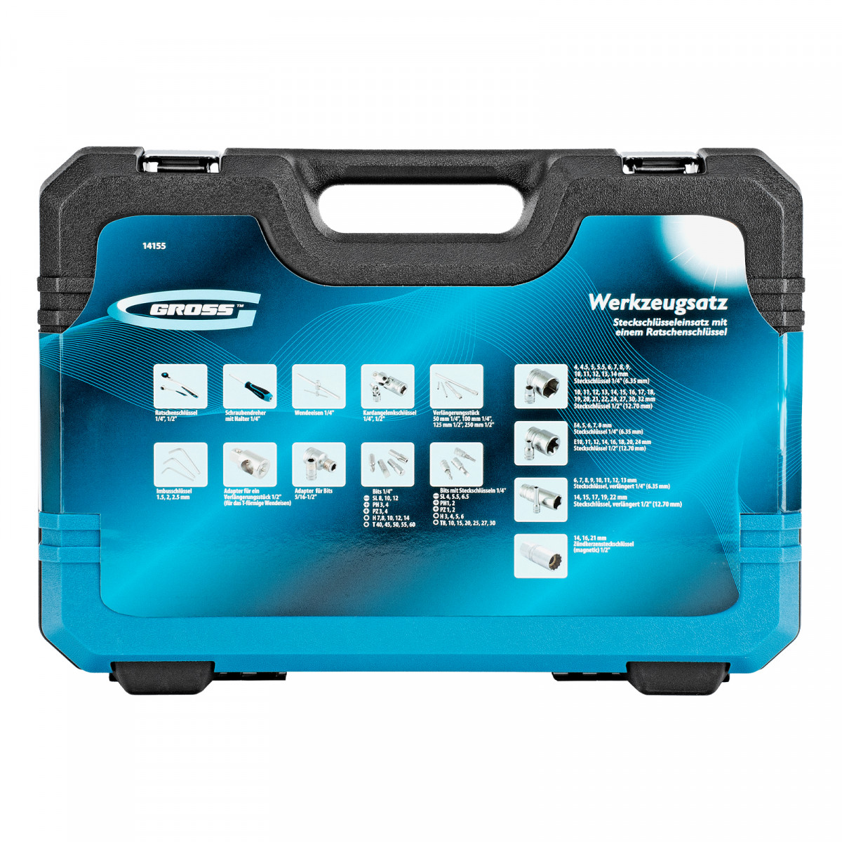 Набор инструментов Gross 14155 включает в себя 109 предметов, в том числе ключи-трещотки из стали CrV со 120 зубьями, с присоединительным размером 1/4" и 1/2". Инструменты используются для монтажа и демонтажа резьбовых соединений. Вороток, удлинители и карданные шарниры облегчают работу в стесненных условиях. Набор пригодится водителям, сотрудникам автосервисов, а также домашним мастерам.