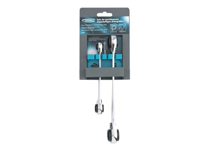 Набор накидных ключей торговой марки GROSS предназначен для монтажа/демонтажа резьбовых соединений (болтов, гаек и пр.). Инструмент изготовлен из высококачественной хромованадиевой (Crv) стали. Набор состоит из двух ключей, оснащенных реверсивным 72-зубчатым храповым механизмом, который позволяет эффективно и быстро проводить работы с резьбовыми соединениями. Первый ключ оснащен захватами 8 х 10 мм с одной стороны и 12 х 13 мм с противоположной, второй ключ соответственно 14 х 17 мм с одной стороны и 18 х 19 мм с противоположной. Минимальный угол поворота ключа GROSS составляет 5 градусов. Хромоникелевое покрытие улучшает антикоррозийные свойства инструмента. Упакован ключ в пластиковую подвесную карту удобную для размещения на стенде.