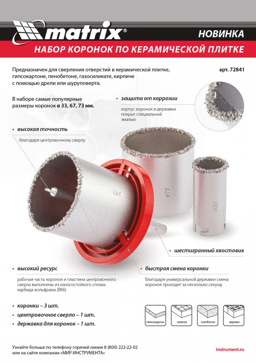 Набор коронок по керамической плитке Matrix 72841 с 6-гранным хвостовиком, 33-67-73 мм, позволяет осуществить сверление отверстий с помощью дрелей и шуруповертов. Он эффективно справляется с керамической плиткой, кирпичом, газосиликатом, гипсокартоном, ячеистым бетоном и пенобетоном. Набор станет незаменимым помощником для частных мастеров. Рекомендуется использовать водяное охлаждение и работать в безударном режиме для предотвращения поломки коронок.1)Универсальный - применяется для сверления отверстий в керамической плитке, пенобетоне, газосиликате, кирпиче, гипсокартоне.2)Быстрая смена коронки - благодаря универсальной державке и специальной формы хвостовика коронки смена коронок проходит за несколько секунд3)Выгодная цена - в наборе только самые ходовые размеры коронок d 33, 67, и 73 мм.4)Высокий ресурс - рабочая часть коронок и пластина центрирующего сверла выполнена из износостойкого сплава карбида вольфрама (ВК6)5)Высокая точность - благодаря центровочному сверлу сверление производится максимально точно 6)Защита от коррозии -корпус коронок и державки покрыт эмалью для защиты от коррозии.