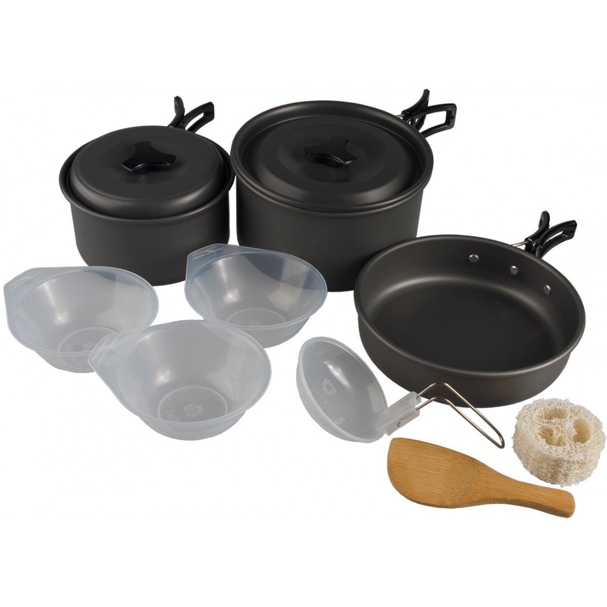 Набор походной посуды «Campsor – 422» из анодированного алюминия, состоящий из кастрюль с крышками и сковороды, позволяет соединить в себе приготовление еды и напитков.
