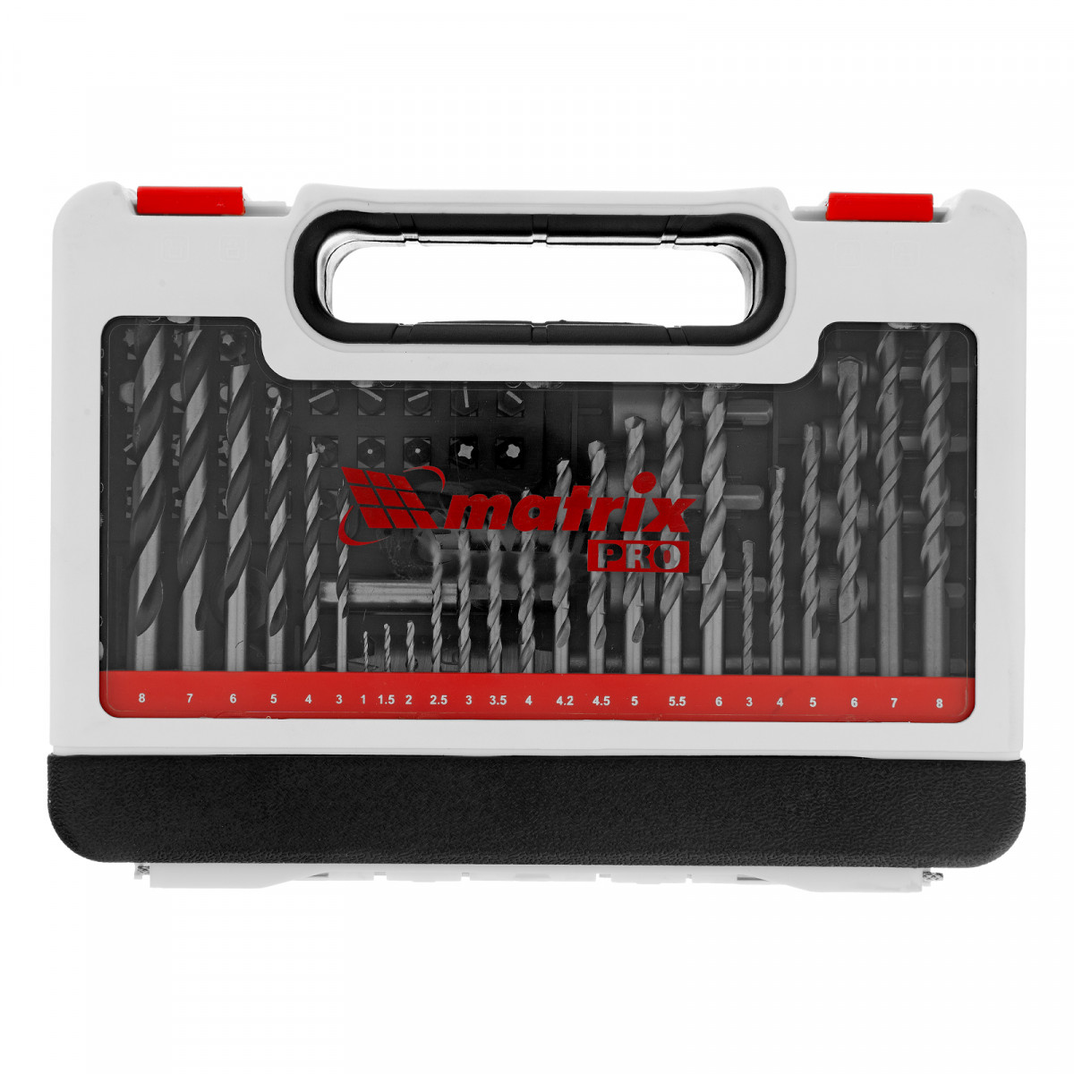 Набор сверл комбинированный, сверла по металлу 1-6 мм, бетону 3-8 мм, дереву 3-8 мм, перовые 16,20,22 мм, биты 30 шт, адаптер, головки 8 шт, 71 предмет Pro Matrix