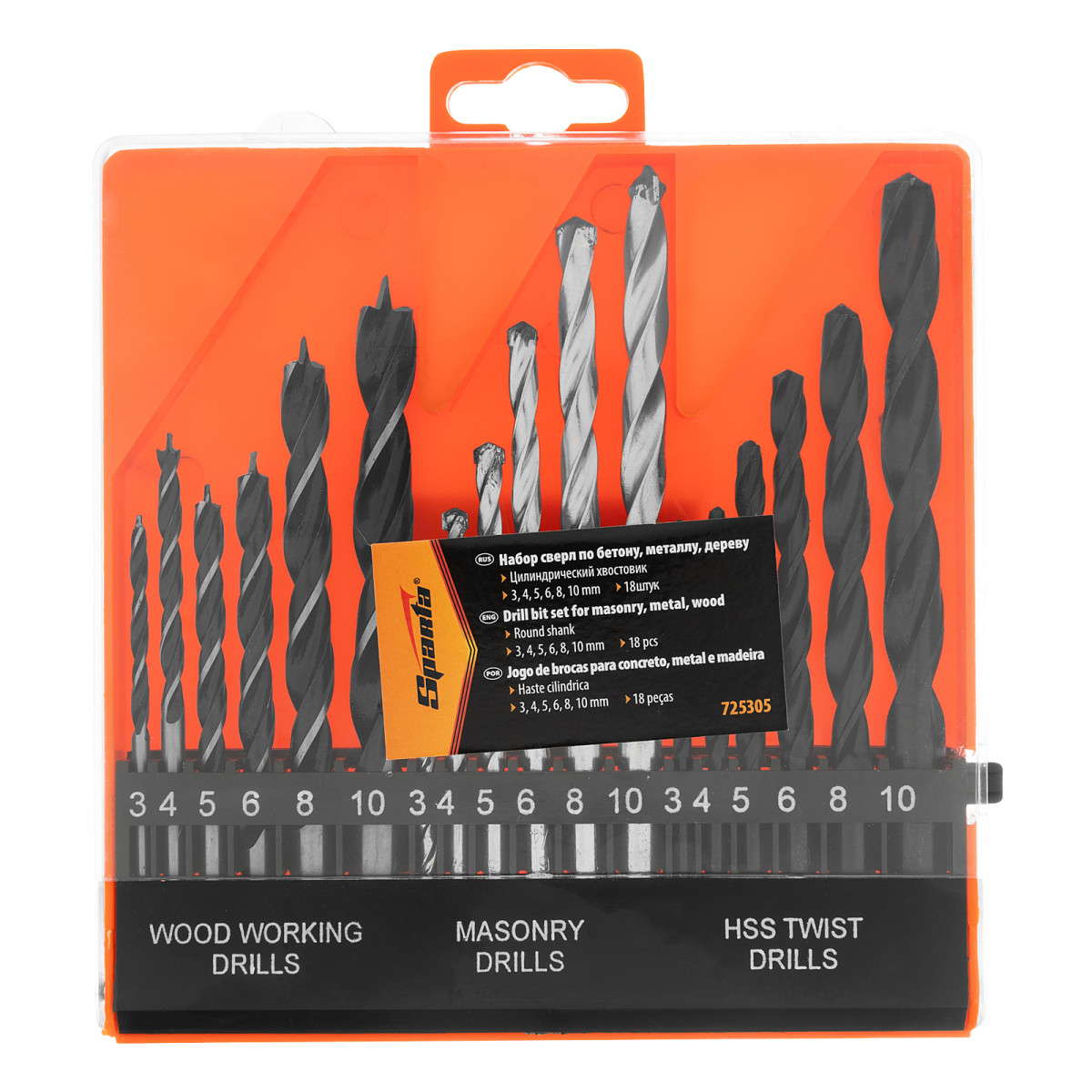 Набор Sparta 725305 включает 18 сверл с цилиндрическим хвостовиком, диаметром 3-4-5-6-8-10 мм, предназначенных для работ по бетону, металлу и дереву. В комплект поставки входят сверла самых популярных размеров, которые используют для бытового ремонта, монтажа и сборки различных конструкций.