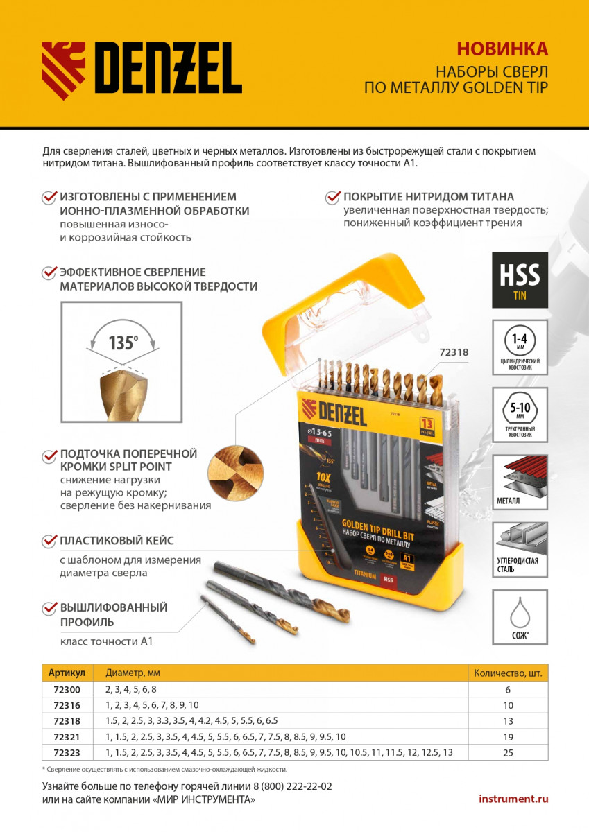 Набор Denzel Golden Tip 72318 включает 13 сверл по металлу для получения отверстий диаметром 1,5-6,5 в стальных заготовках. Оснастка вышлифована на высокоточном оборудовании и имеет класс точности A1, что позволяет эффективно решать поставленные задачи. Сверла упакованы в пластиковый кейс, с помощью которого можно измерить их диаметр: в крышке предусмотрен специальный шаблон.
