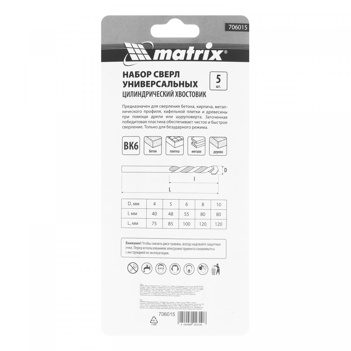 Набор Matrix 706015 состоит из 5 универсальных сверл длиной от 75 до 120 мм, позволяющих получать отверстия диаметром 4-10 мм в древесине, керамической плитке, а также в стали и бетоне с помощью дрели или шуруповерта. Твердосплавные режущие пластины обеспечивают эффективную работу с любыми материалами. Набор пригодится в мастерской, гараже, а также дома и на даче.