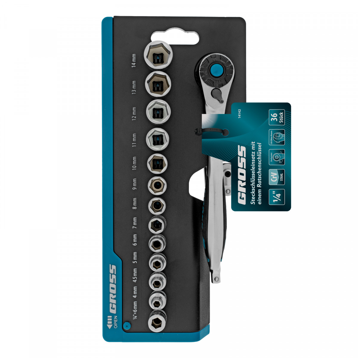 Набор торцевых головок, трещотка 120 зубьев, 1/4", CrV, 36 предметов Gross