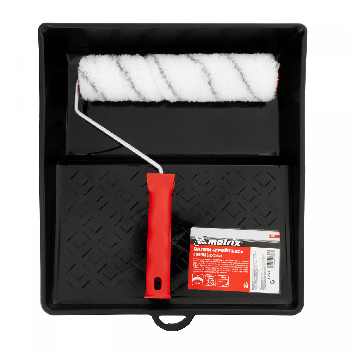 Набор Matrix 84405 включает валик «Грейтекс» размером 250 х 36 мм, с ворсом 12 мм из полиакрила, и кювету размером 330 х 350 мм. Кювета подходит для валиков шириной 250 мм, позволяет набирать и равномерно распределять краску. Шубка из полиакрила подходит для малярных работ на средне-гладких поверхностях с ЛКМ любого типа, в том числе содержащими растворители.