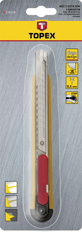Нож с отламывающимся лезвием TOPEX для работы с лезвиями шириной 9 мм. Предназначен для выполнения механических работ, а также работ, выполняемых мастерами-любителями. Корпус изготовлен из высококачественной пластмассы. Металлическая направляющая обеспечивает долгий срок службы. Небольшой размер облегчает транспорт и хранение.