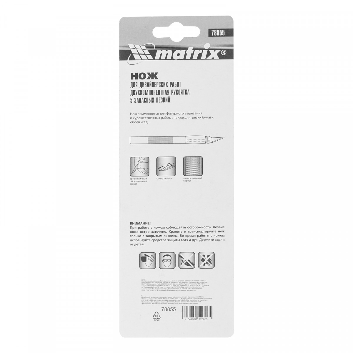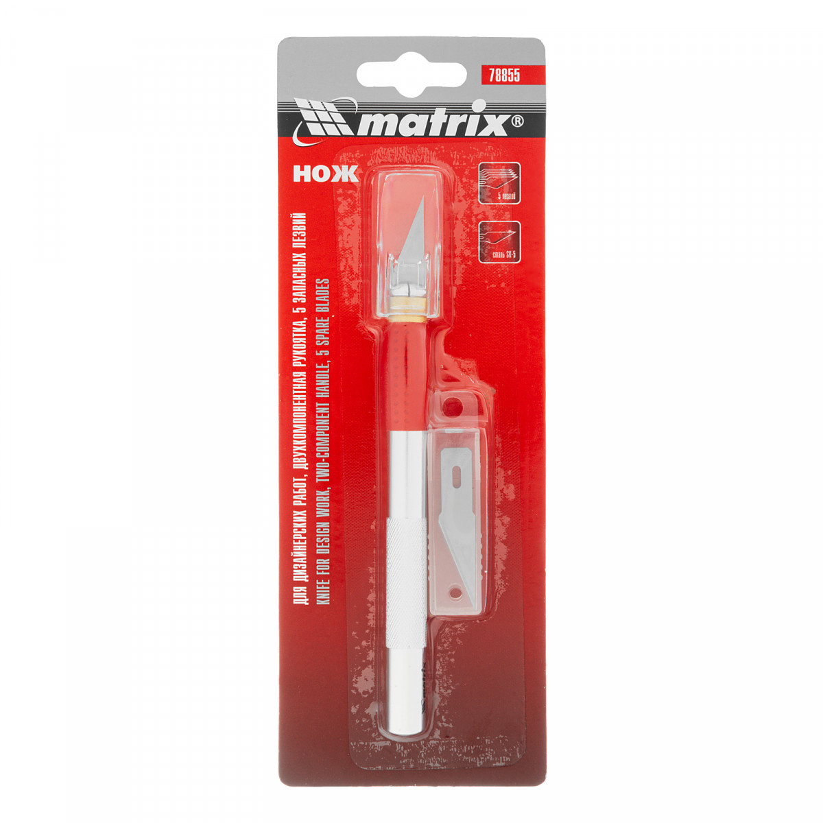 Нож Matrix 78855 с двухкомпонентной рукояткой и 5 запасными лезвиями, используется для дизайнерских работ: фигурного вырезания, изготовления мелких декоративных элементов. Он эффективно справляется с резкой бумаги и обоев, позволяя получить художественный результат.