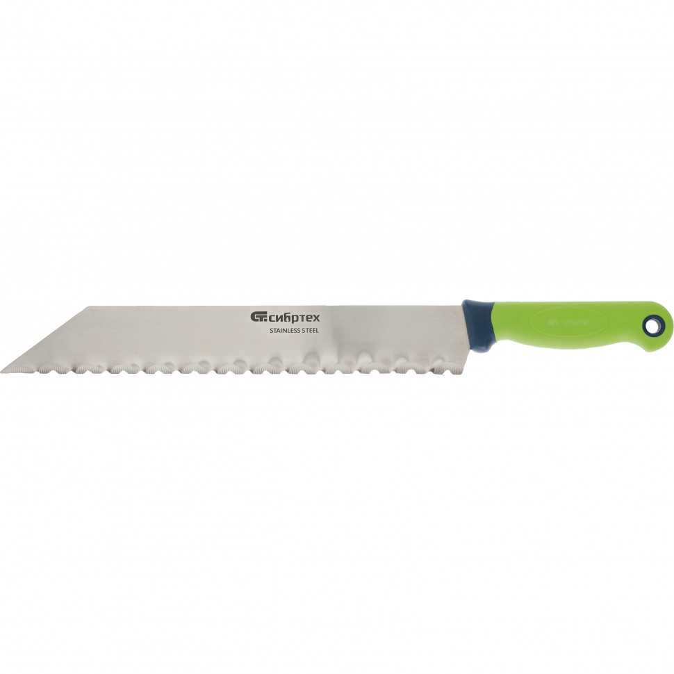Нож Сибртех 79025 общей длиной 475 мм и длиной лезвия 340 мм, с обрезиненной рукояткой, предназначен для резки теплоизоляционных панелей. Он пригодится в ходе проведения строительных работ при укладке утеплителя. Лезвие длиной 340 мм легко справляется с резкой длинных и толстых пластов.За счет острозаточенного лезвия из нержавеющей стали нож можно использовать в условиях повышенной влажности и на открытом воздухе.
