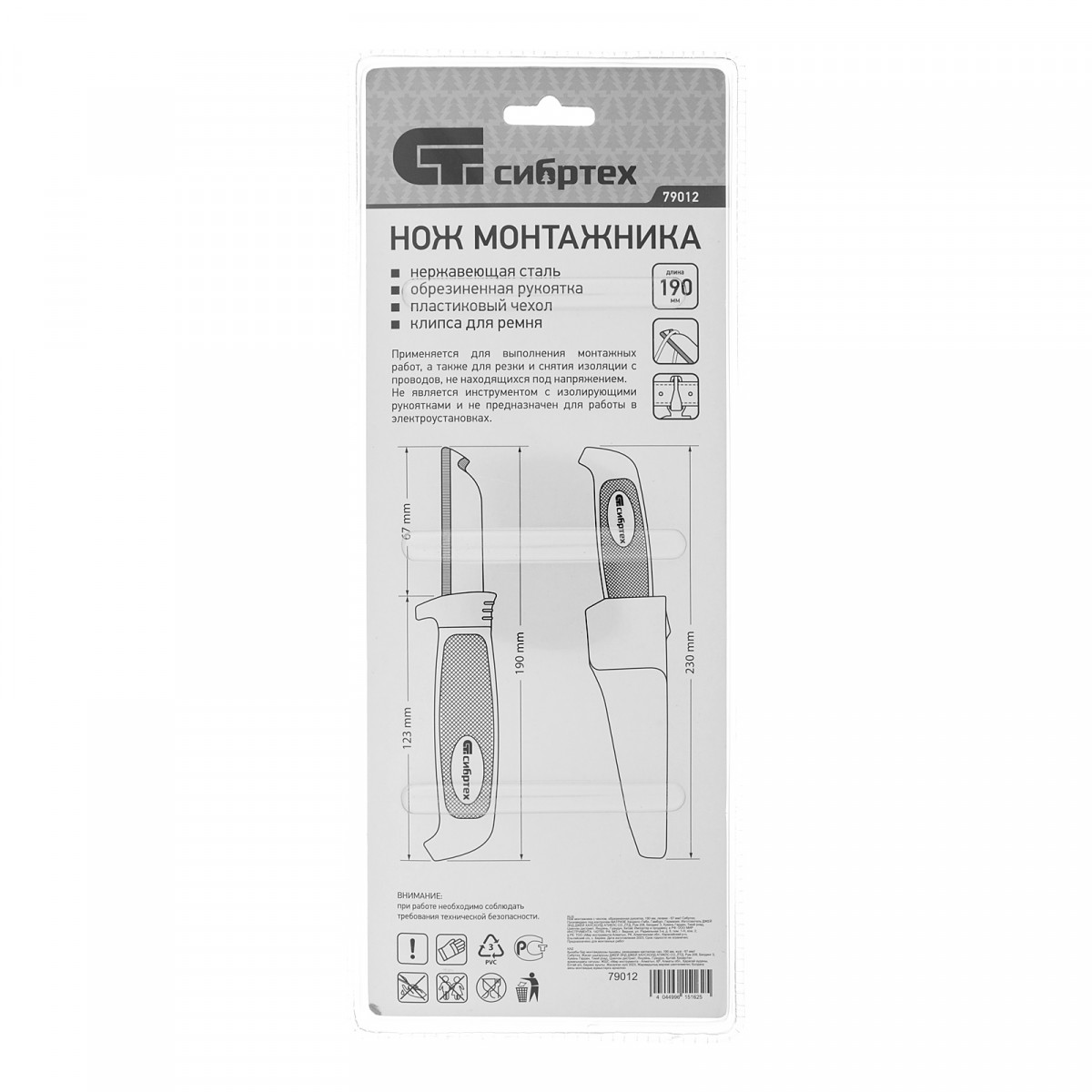 Нож монтажника Сибртех 79012 общей длиной 190 мм и длиной лезвия 67 мм, с чехлом и обрезиненной рукояткой, предназначен для работ с проводкой. С его помощью можно зачистить и обрезать кабель. Нож с пластиковым чехлом безопасен при транспортировке, поэтому его удобно брать с собой на выездные работы.