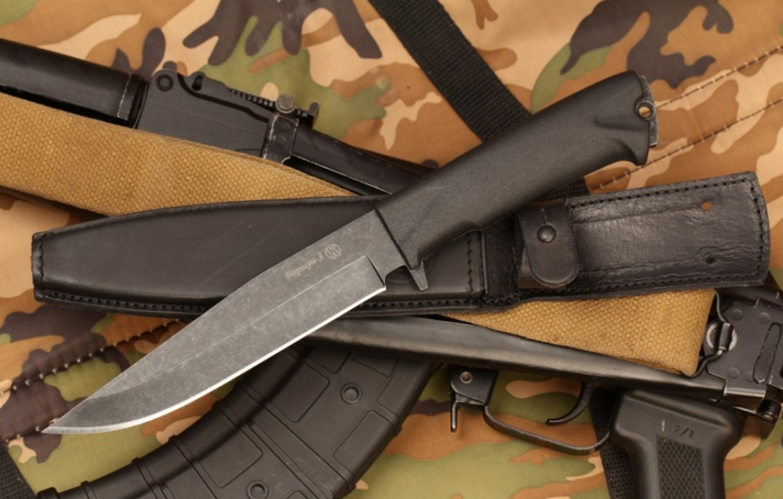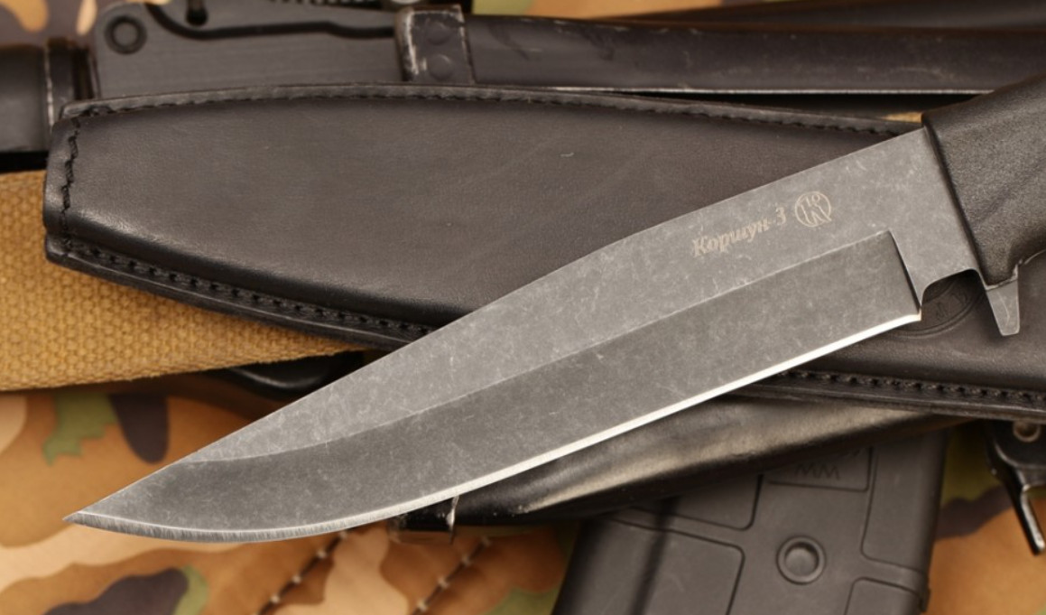 Простой и брутальный нож Коршун-3 разработан специально для тех, кому нужен один нож на все случаи жизни. Нож станет отличным помощником туристу или рыболову, охотнику или солдату спецподразделения. Несмотря на то, что перед этим людьми стоят разные задачи - нож легко справится с каждой из них. Клинок ножа выполнен из стали устойчивой к коррозии и закален до 57-59 HRC. Благодаря толстому обуху в 5,2 миллиметра, нож легко выполнит тяжелую работу, поможет обустроить лагерь и наколоть щепок на костер. За счет высоких спусков и тонкого сведения нож имеет отличные режущие свойства и хорошо работает по материалам любой плотности. Эргономичная рукоять выполнена их эластрона. Рукоять в нижней части имеет ограничители для предотвращения соскальзывания ладони при совершении силовой работы. Нож выполнен по технологии сквозного монтажа: хвостовик проходит рукоять насквозь и выступает с обратной стороны, образую ударную платформу с темлячным отверстием.Нож укомплектован ножнами из качественной кожи. Ножны украшены изображением орла, который побеждает змею.