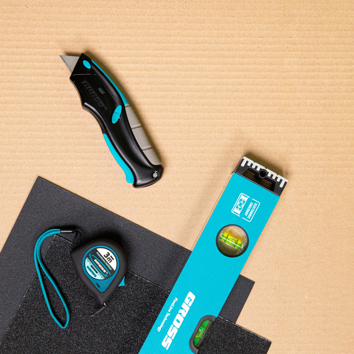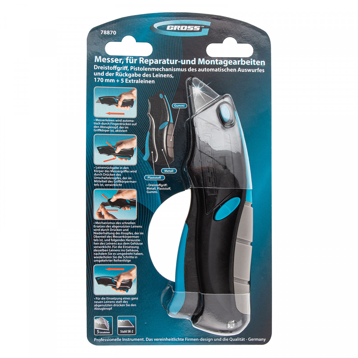 Ремонтно-монтажный нож пистолетного типа Gross 78870 длиной 170 мм, с трехкомпонентной рукояткой, автовыбросом/возвратом лезвия и 5 запасными лезвиями, применяется для разрезания линолеума, картона, кожи и других материалов. Лезвия изготовлены из высокопрочной японской стали SK-2, поэтому не ломаются и долго не тупятся. Инструмент предназначен для профессиональных работ, но может использоваться и в быту.