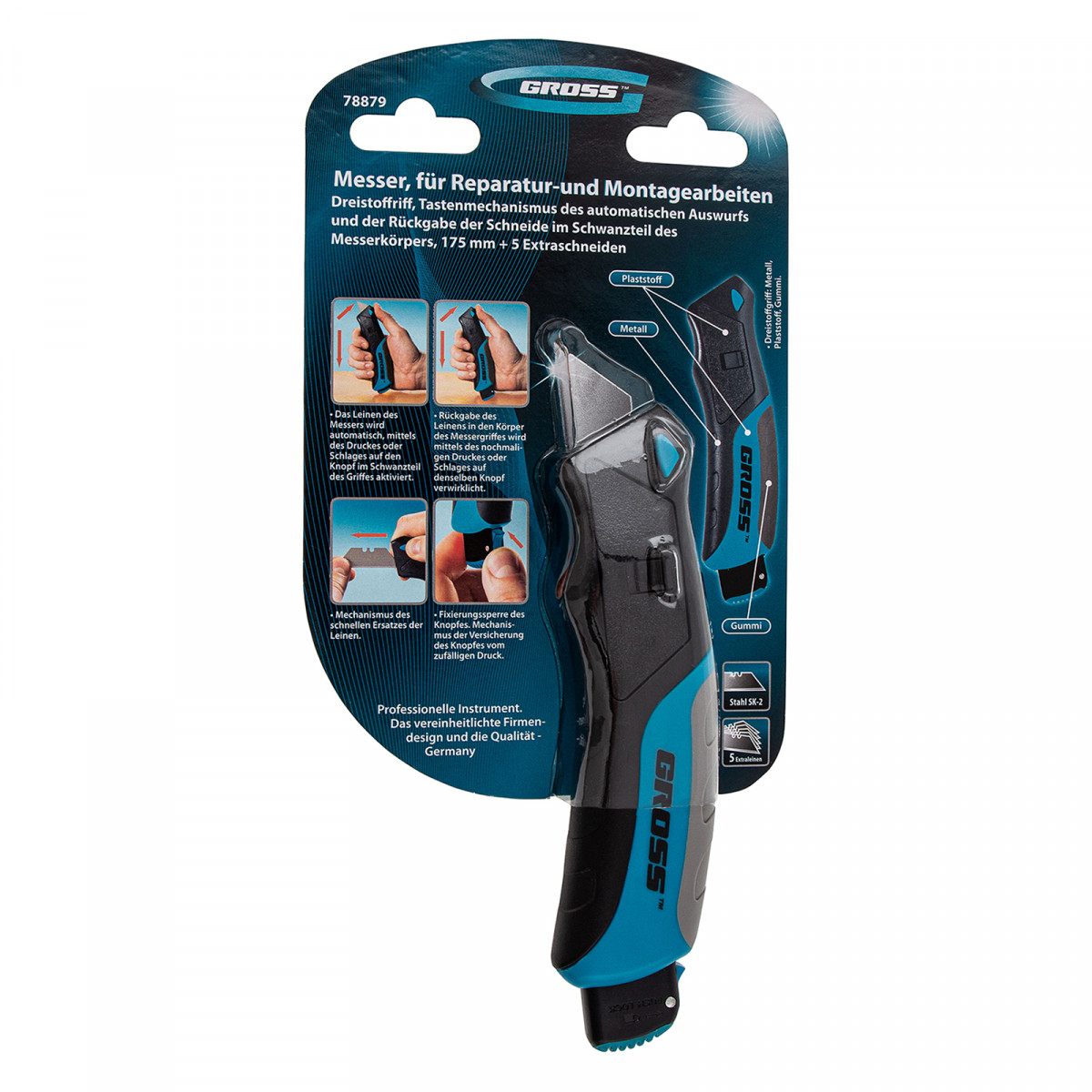 Ремонтно-монтажный нож Gross 78879 длиной 175 мм, с кнопочным автоматическим выбросом и возвратом лезвия, трехкомпонентной рукояткой и 5 запасными лезвиями, поможет раскроить линолеум или обои, разрезать картон, тонкий пластик, кожу, провода. Удобен в использовании — выброс лезвия и его возврат происходят автоматически при нажатии на кнопку с тыльной стороны корпуса. Нож является инструментом профессионального назначения, также будет полезен в быту.