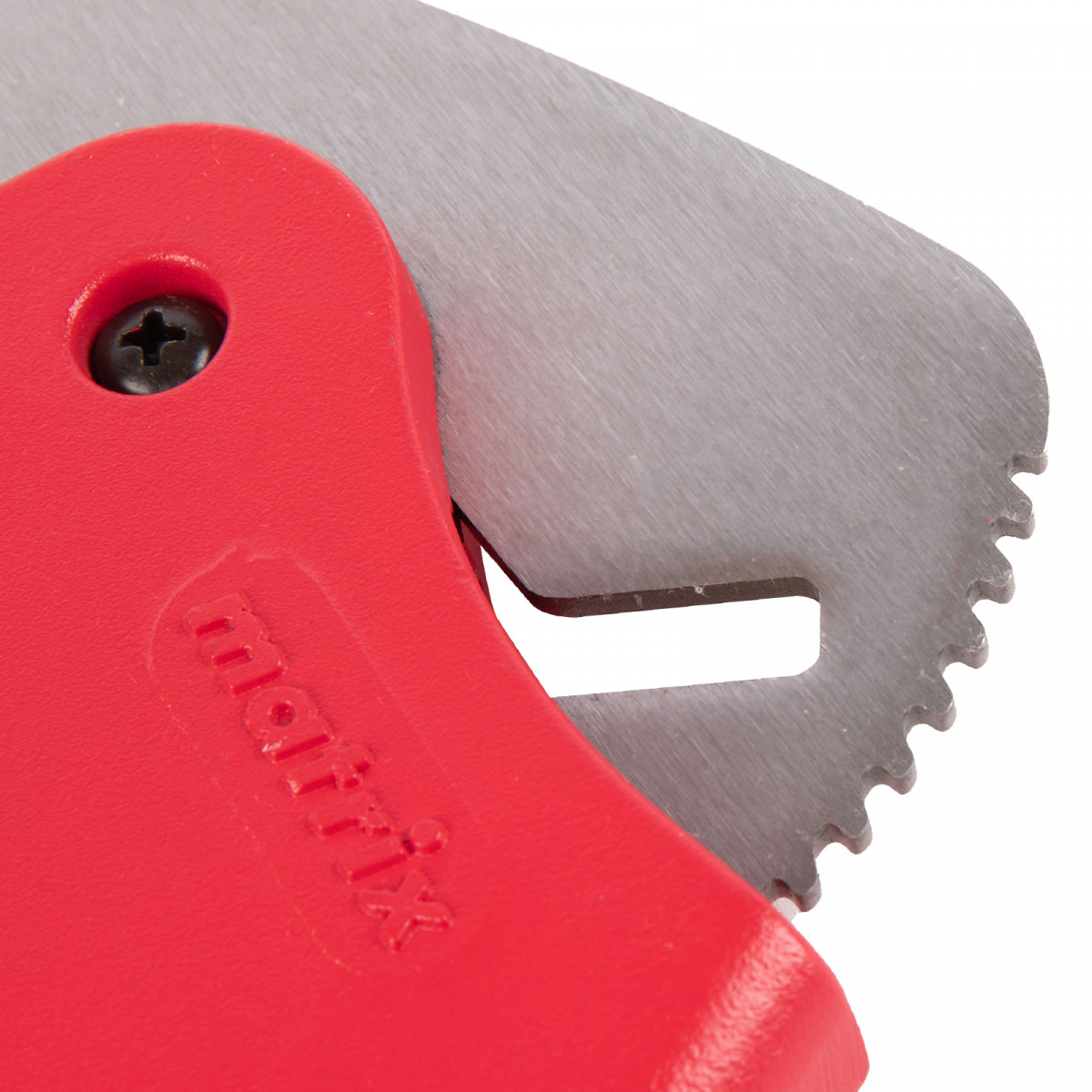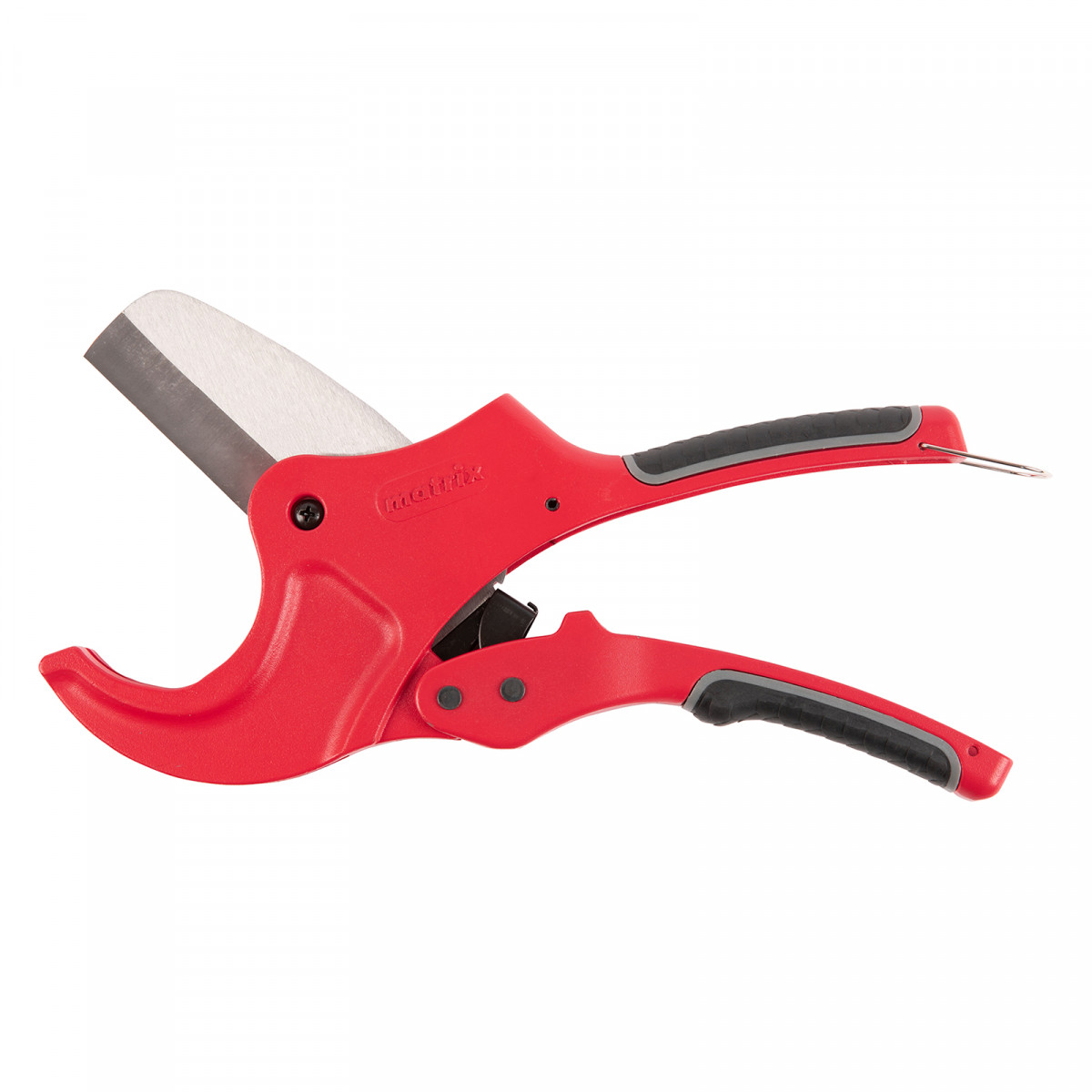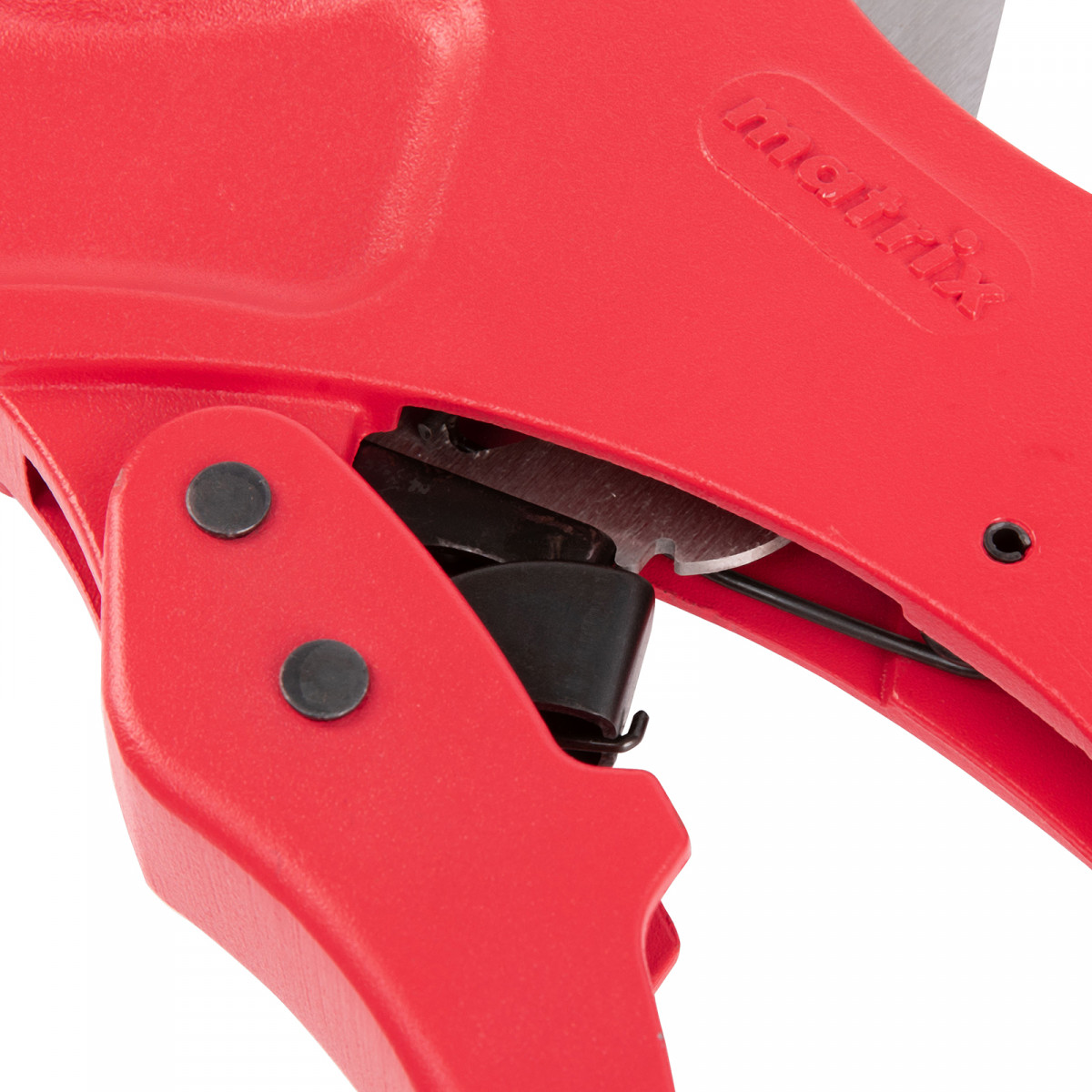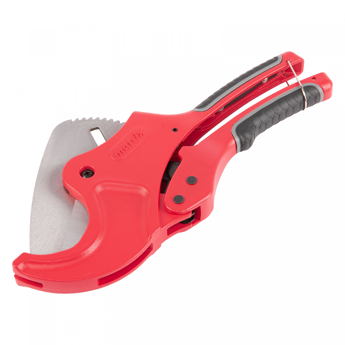 Ножницы для резки изделий из ПВХ Matrix 78419 с лезвием из нержавеющей стали и функцией автоматического раскрытия применяются для работы с пластиковыми трубами диаметром до 63 мм, а также для разрезания профилей, плинтусов, галтелей, реек, планок, резиновых шлангов и других предметов. Прямой нож инструмента позволяет резать плоские заготовки. Ножницы пригодятся для выполнения сантехнических и отделочных работ., , Преимущества, Прочность и долговечность — режущее полотно изготовлено из нержавеющей стали 3CR13., Защита от коррозии — на корпус нанесено порошковое покрытие., Высокая эффективность — механизм автоматического раскрытия позволяет выполнять работу быстрее, не прикладывая больших усилий., Комфортная работа без ощущения усталости — храповой механизм минимизирует прикладываемые усилия., Безопасное хранение и транспортировка — рукоятки можно заблокировать в сведенном положении., , Для корректной работы инструмента, чтобы предотвратить перекос лезвия относительно ПВХ-трубы, рекомендуется, чтобы отрезаемая часть была больше или равна внешнему диаметру ПВХ-трубы. В противном случае может возникнуть перекос лезвия, что также может привести к поломке лезвия/инструмента.