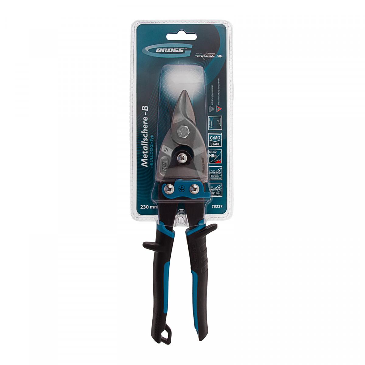 Ножницы по металлу Gross PIRANHA 78327 длиной 230 мм, из стали CrMo, с двухкомпонентными рукоятками и механизмом «bulldog», предназначены для прямого усиленного реза плоских заготовок из цветных металлов и сталей разных марок. Благодаря усиленному двухрычажному механизму «bulldog» инструмент справляется с холоднокатаной сталью толщиной до 1,6 мм и с «нержавейкой» толщиной до 1,2 мм. Ножницы рекомендованы для профессионального применения, пригодятся также и в быту.
