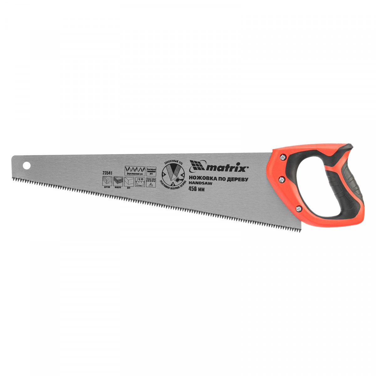 Ножовка по дереву Matrix 23541 с полотном длиной 450 мм, с калеными зубьями с 3D-заточкой и шагом 7-8 TPI, с двухкомпонентной рукояткой, используется для продольного и поперечного пиления досок, брусков, листов фанеры, ДСП. Благодаря трехгранной заточке зубьев пила характеризуется высокой производительностью. Шаг зубьев составляет 7-8 TPI, что обеспечивает быстрый и качественный рез. Ножовка пригодится в столярной мастерской, а также будет полезна в хозяйстве.
